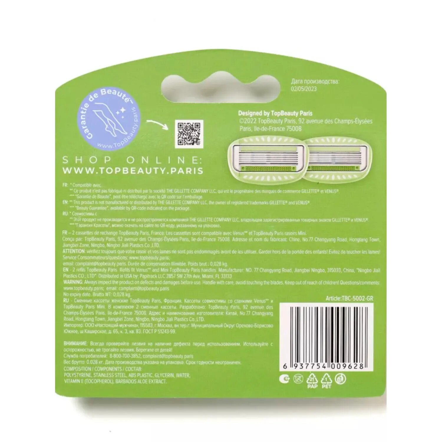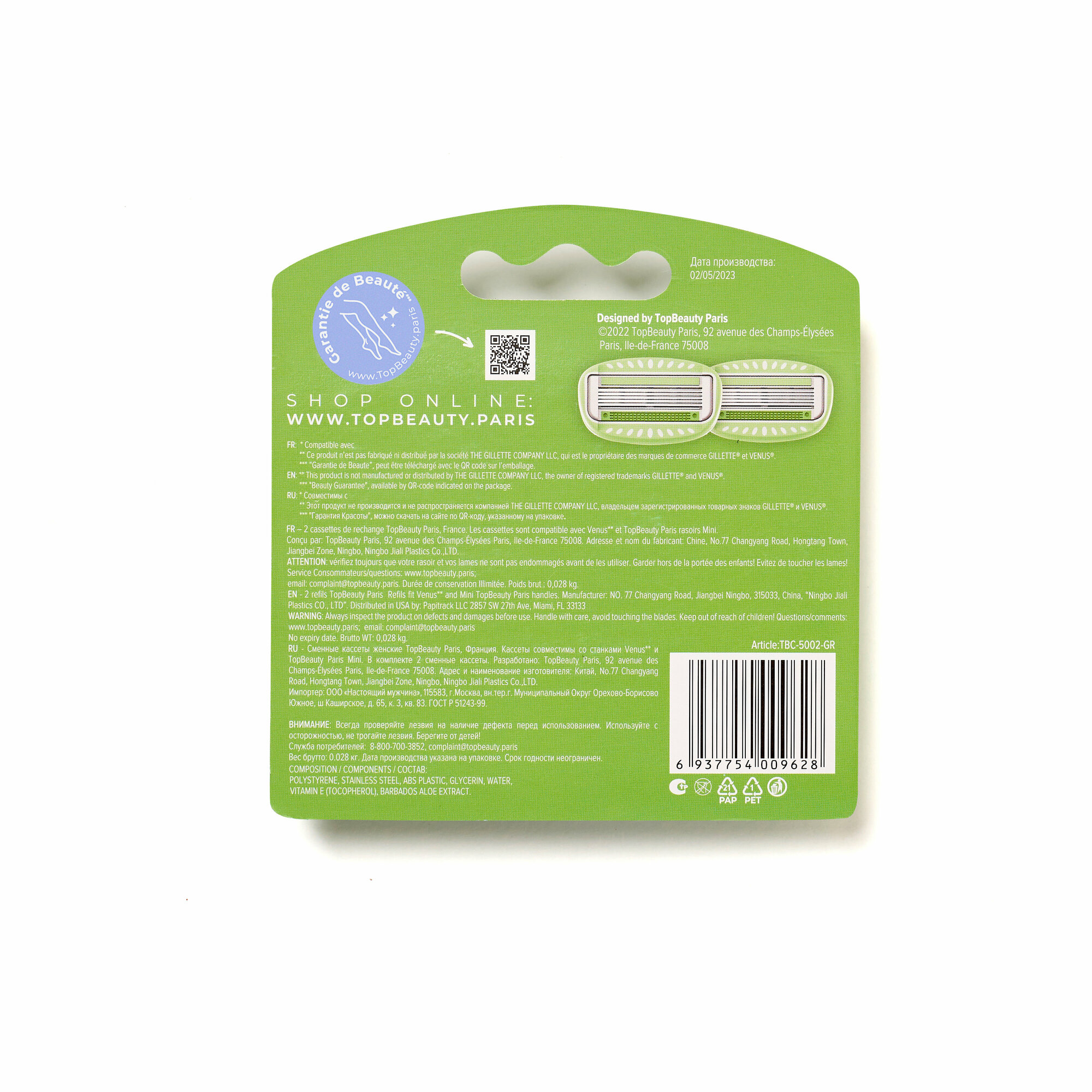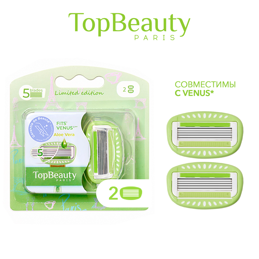 Кассеты для бритвенных станков TopBeauty Paris Cменные женские, 5 лезвий, зеленый цвет, совместимы с Venus, 2 шт