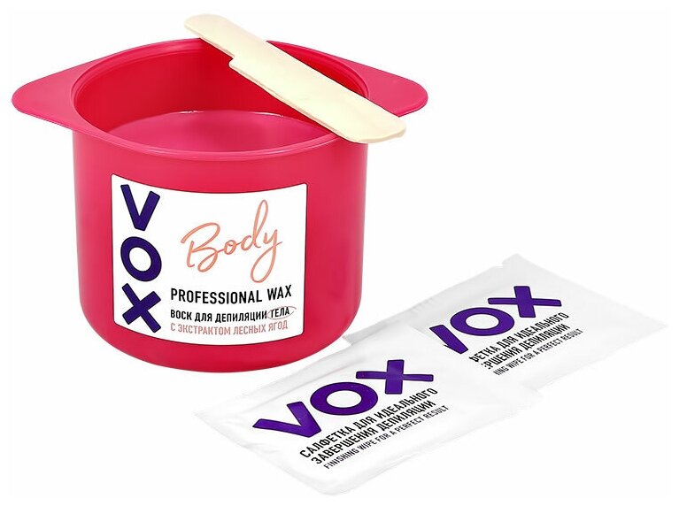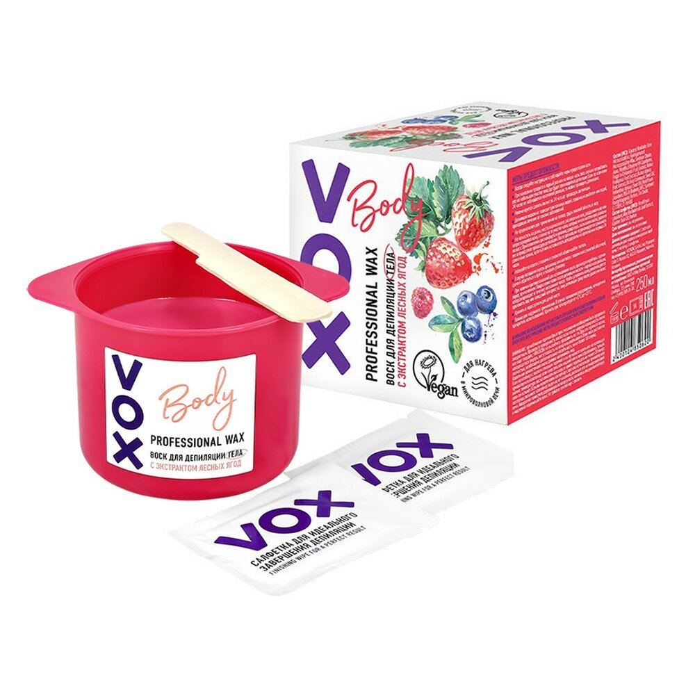 Купить Воск для депиляции VOX для нагрева в микроволновой печи с экстрактом лесных ягод 250 мл,2 салфетки,1 палочка