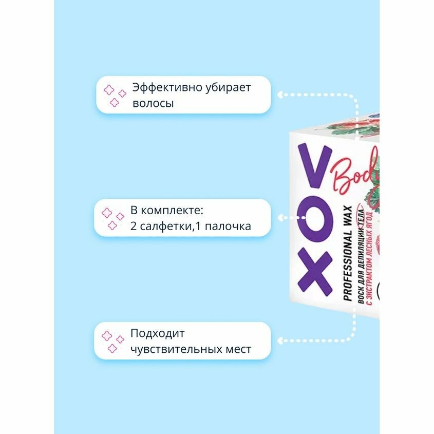 Воск для депиляции VOX для нагрева в микроволновой печи с экстрактом лесных ягод 250 мл,2 салфетки,1 палочка интересное: