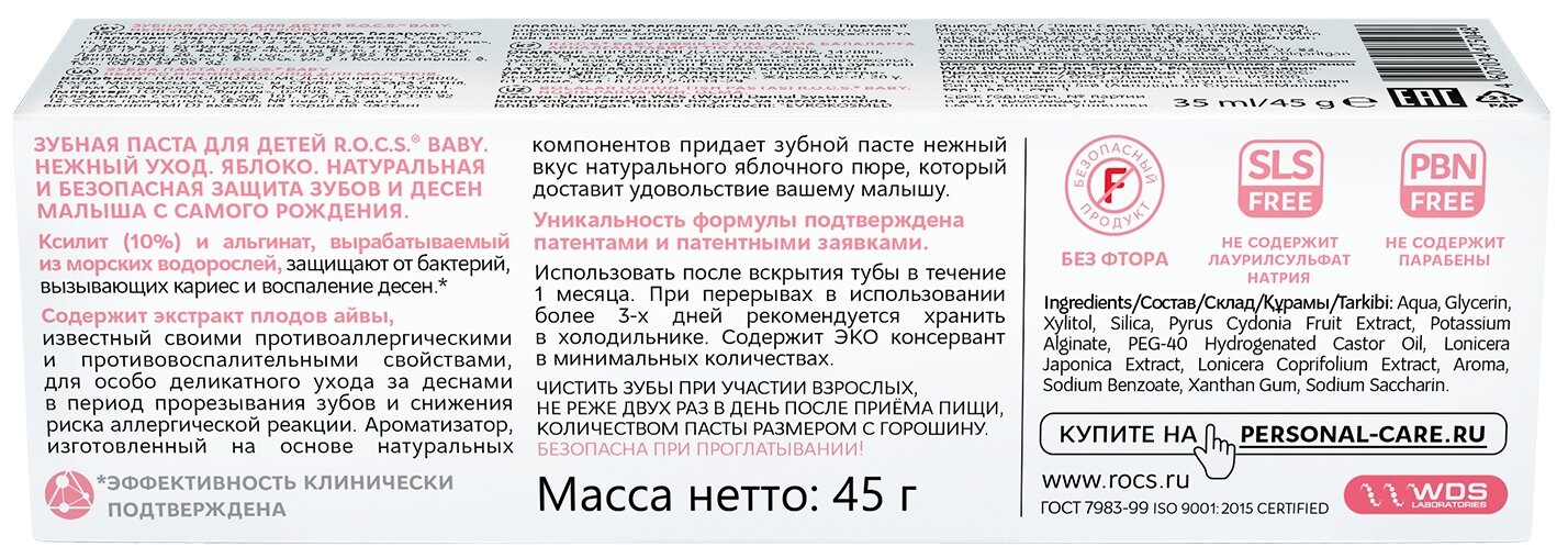 Зубная паста R.O.C.S. Baby Нежный уход, яблоко, 0-3 лет, 45 мл, 45 г