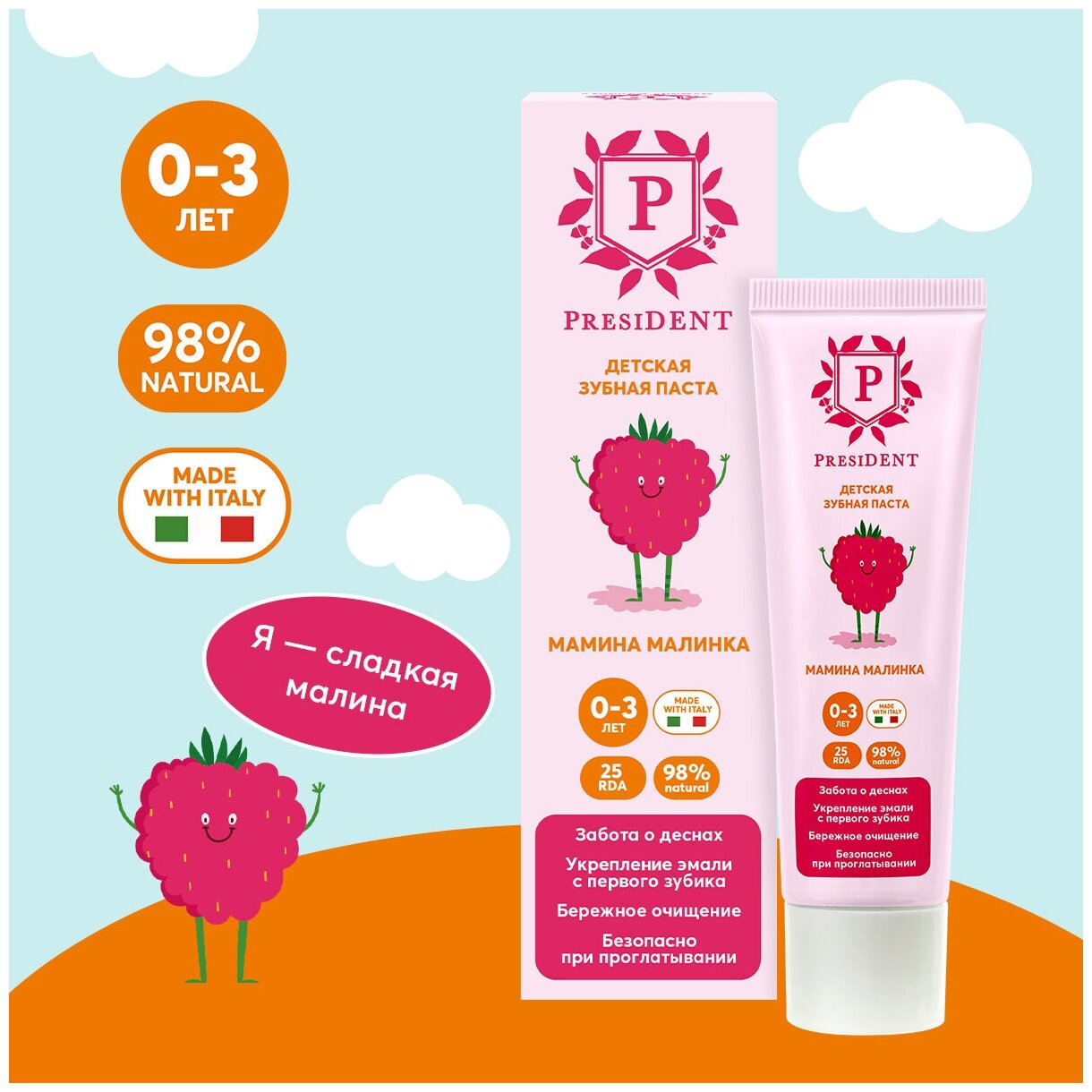 Президент паста зубная детская от 0 до 3 ЛЕТ мамина малинка (25 RDA) туба 32Г