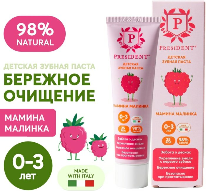 зубная паста детская PRESIDENT 0-3 Мамина малинка (25 RDA) 32 г интересное: