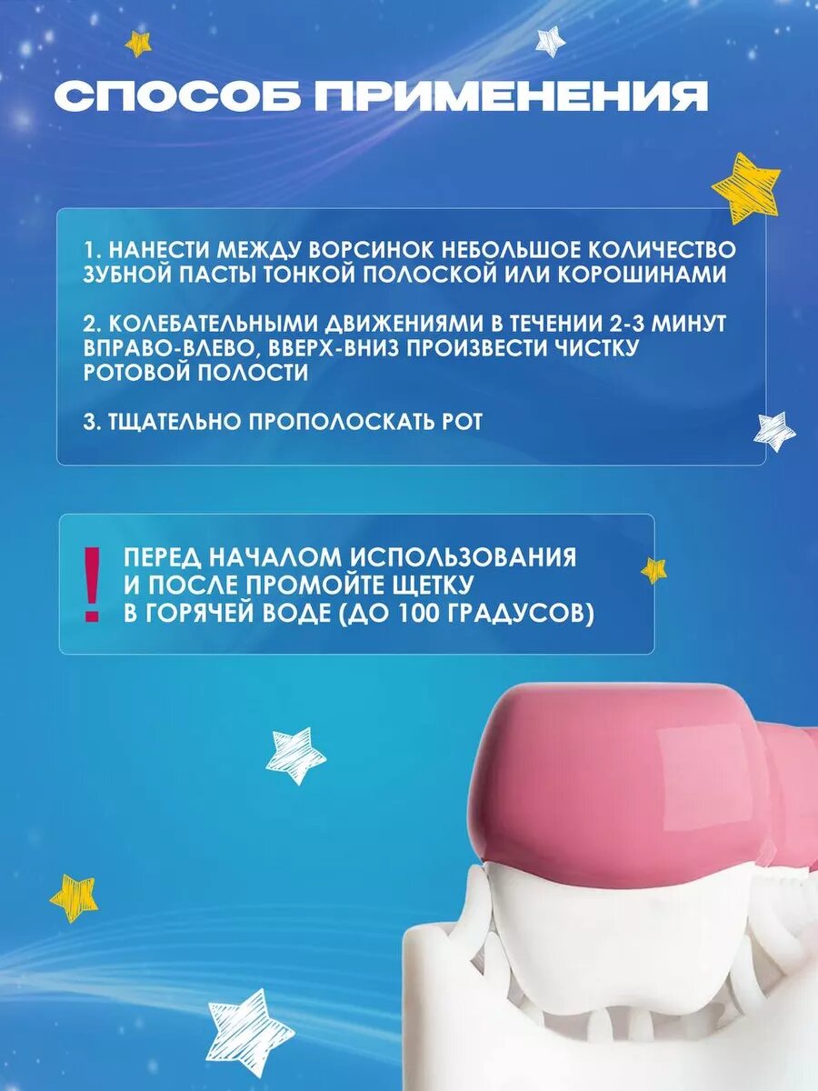 | Способ применения | 1) Нанести между ворсинок небольшое количество зубной пасты тонкой полоской или горошинами. 2) Колебательными движениями в течении 2 - 3 минут вправо-влево, вверх-вниз произвести чистку ротовой полости. 3) тщательно прополоскать рот. |
