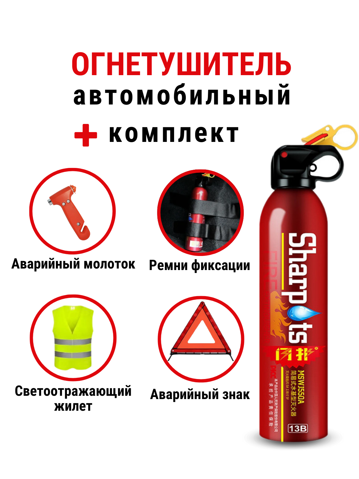 Огнетушитель автомобильный воздушно-пенный Sharp аэрозольный + ремни фиксации, аварийный молоток, светоотражающий жилет и аварийный знак, 0,55 л интересное: