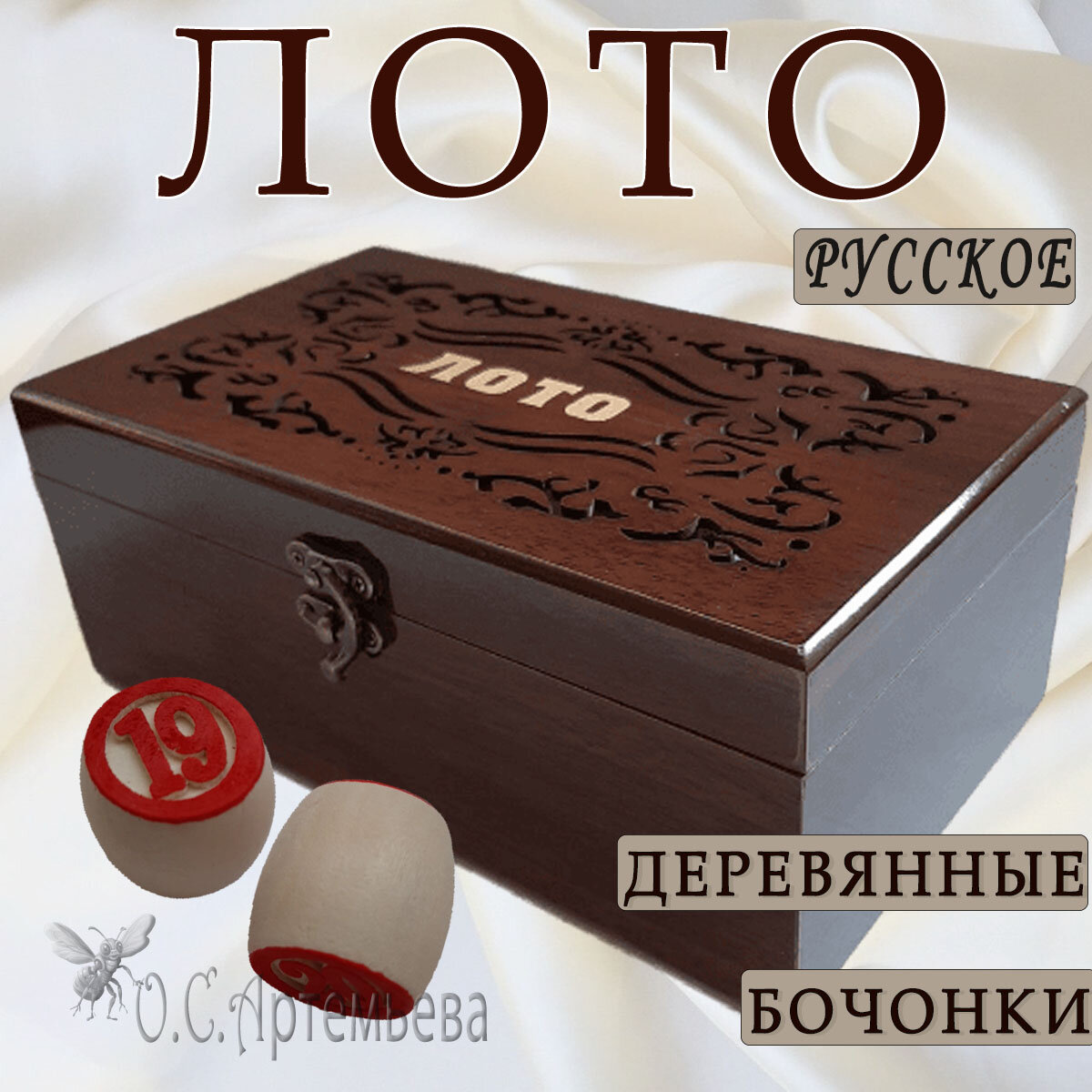 Настольная игра Русское лото с деревянными бочонками в стильной шкатулке под дерево, крышка с резным рисунком арабеска