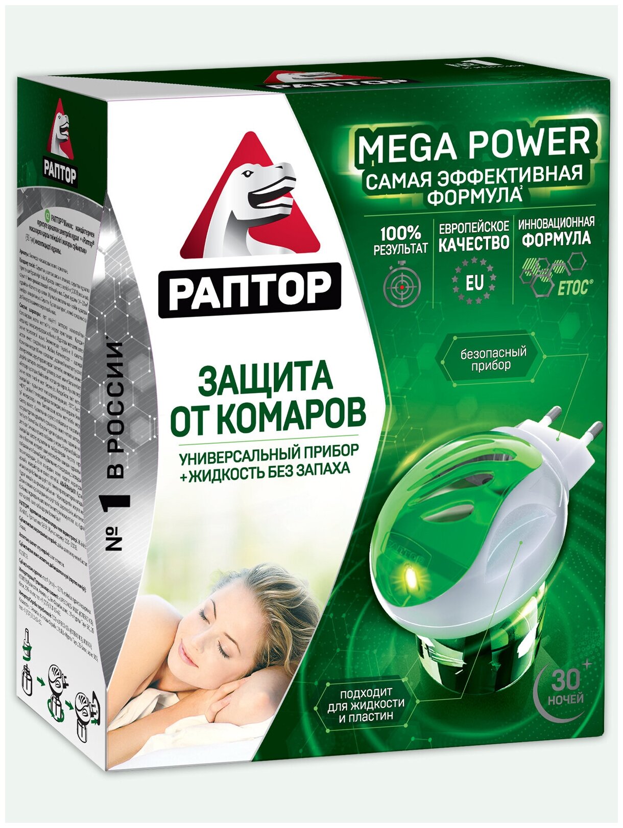Комплект от комаров повышенной эффективности Раптор Mega Power, фумигатор и жидкость от комаров,30 ночей, 1 шт