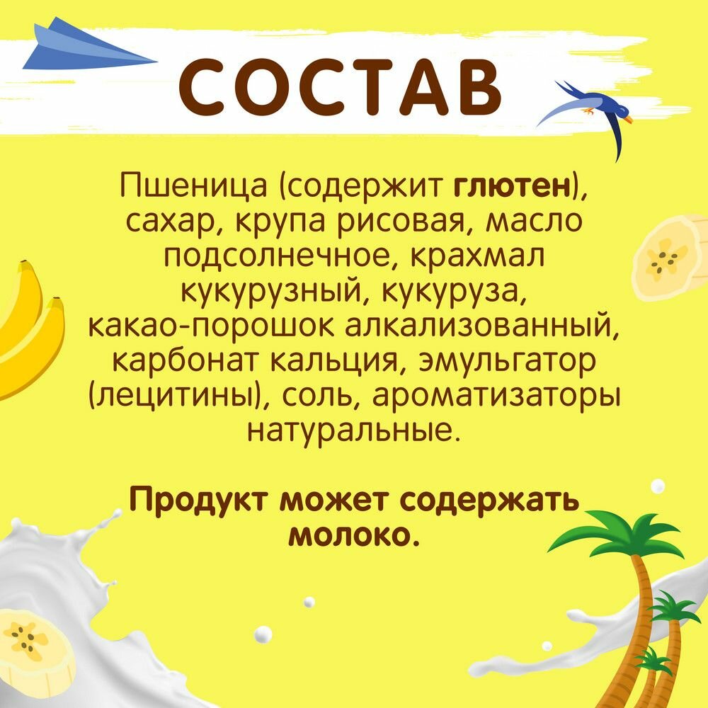 | Состав | пшеница (содержит глютен) / сахар / крупа рисовая / масло подсолнечное / крахмал кукурузный / кукуруза / какао-порошок алкализованный / карбонат кальция / эмульгатор (лецитины) / соль / ароматизаторы натуральные. Продукт может содержать молоко. |