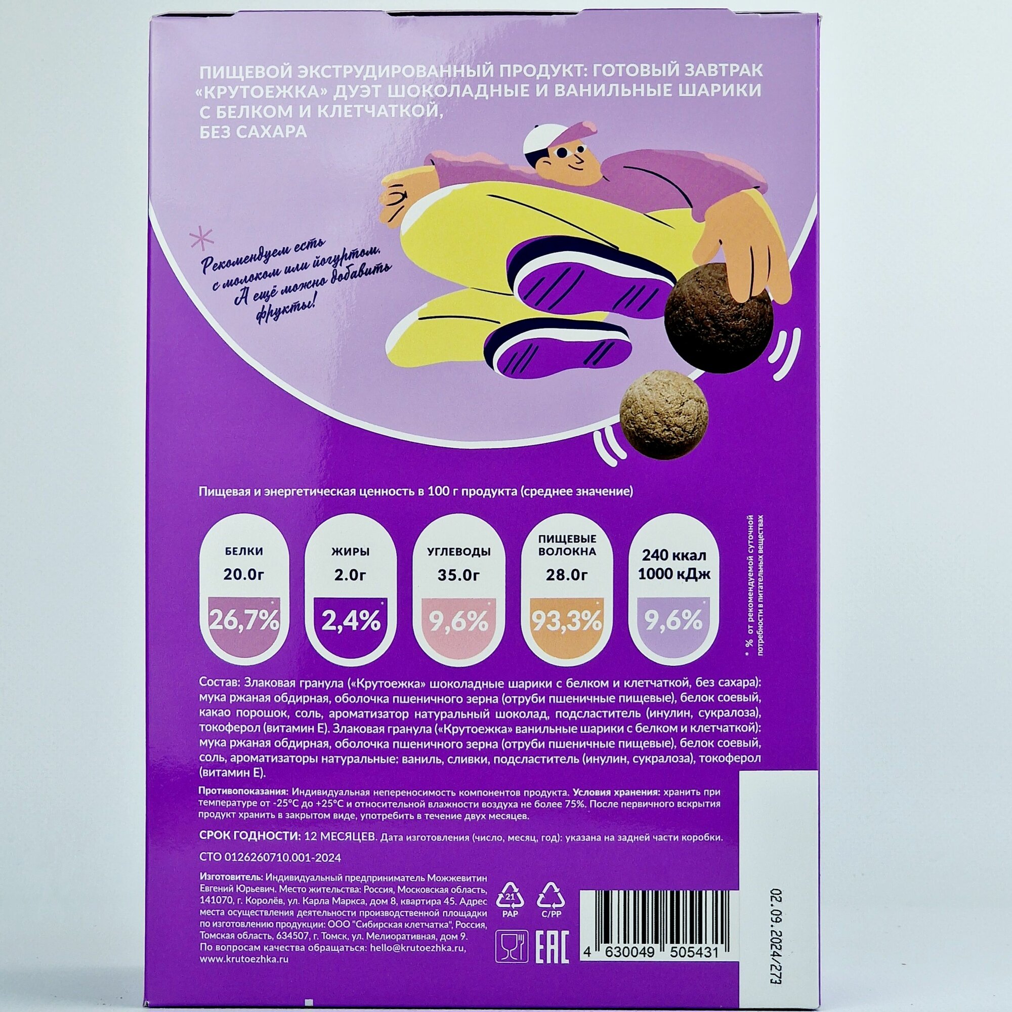 | Состав | Злаковая гранула («Крутоежка» шоколадные шарики с белком и клетчаткой / без сахара): мука ржаная обдирная / оболочка пшеничного зерна (отруби пшеничные пищевые) / белок соевый / какао порошок / соль / ароматизатор натуральный шоколад / подсластитель (инулин / сукралоза) / токоферол (витамин Е). Злаковая гранула («Крутоежка» ванильные шарики с белком и клетчаткой): мука ржаная обдирная / оболочка пшеничного зерна (отруби пшеничные пищевые) / белок соевый / соль / ароматизаторы натуральные: ваниль / сливки / подсластитель (инулин / сукралоза) / токоферол (витамин Е) |