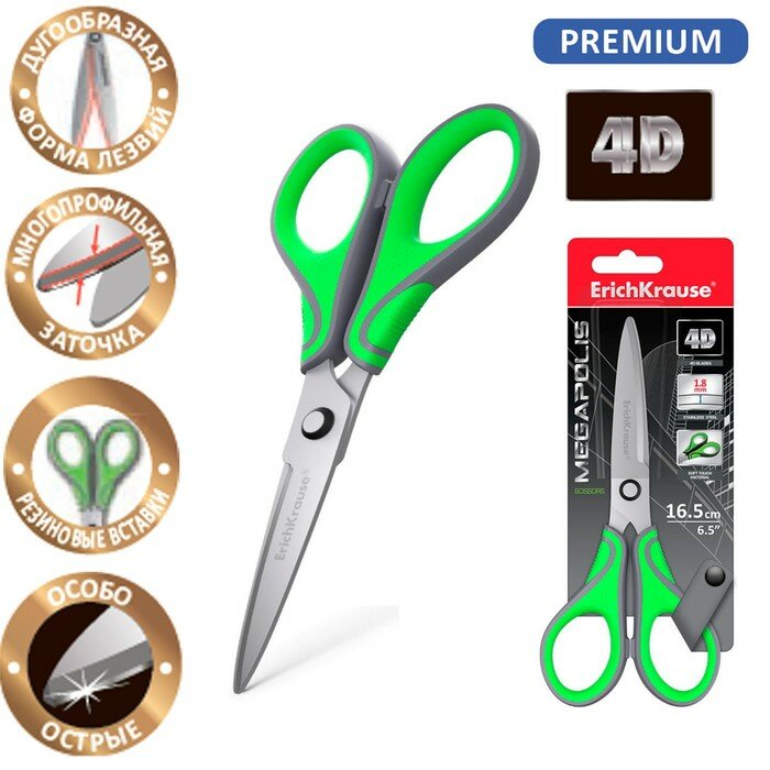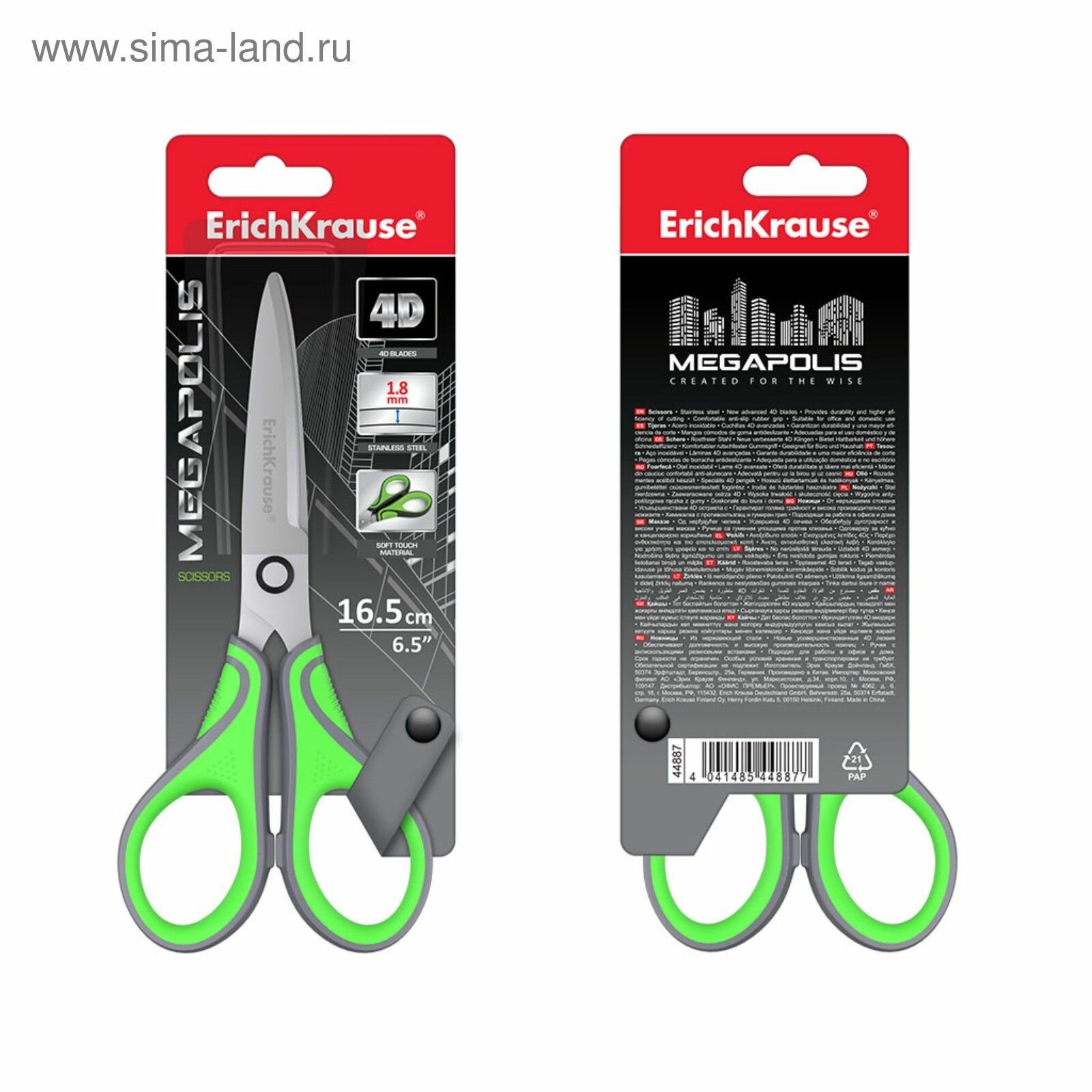 Ножницы 16.5 см ErichKrause Megapolis, с усовершенствованными 4D-лезвиями, не ржавеют, ручки с резин
