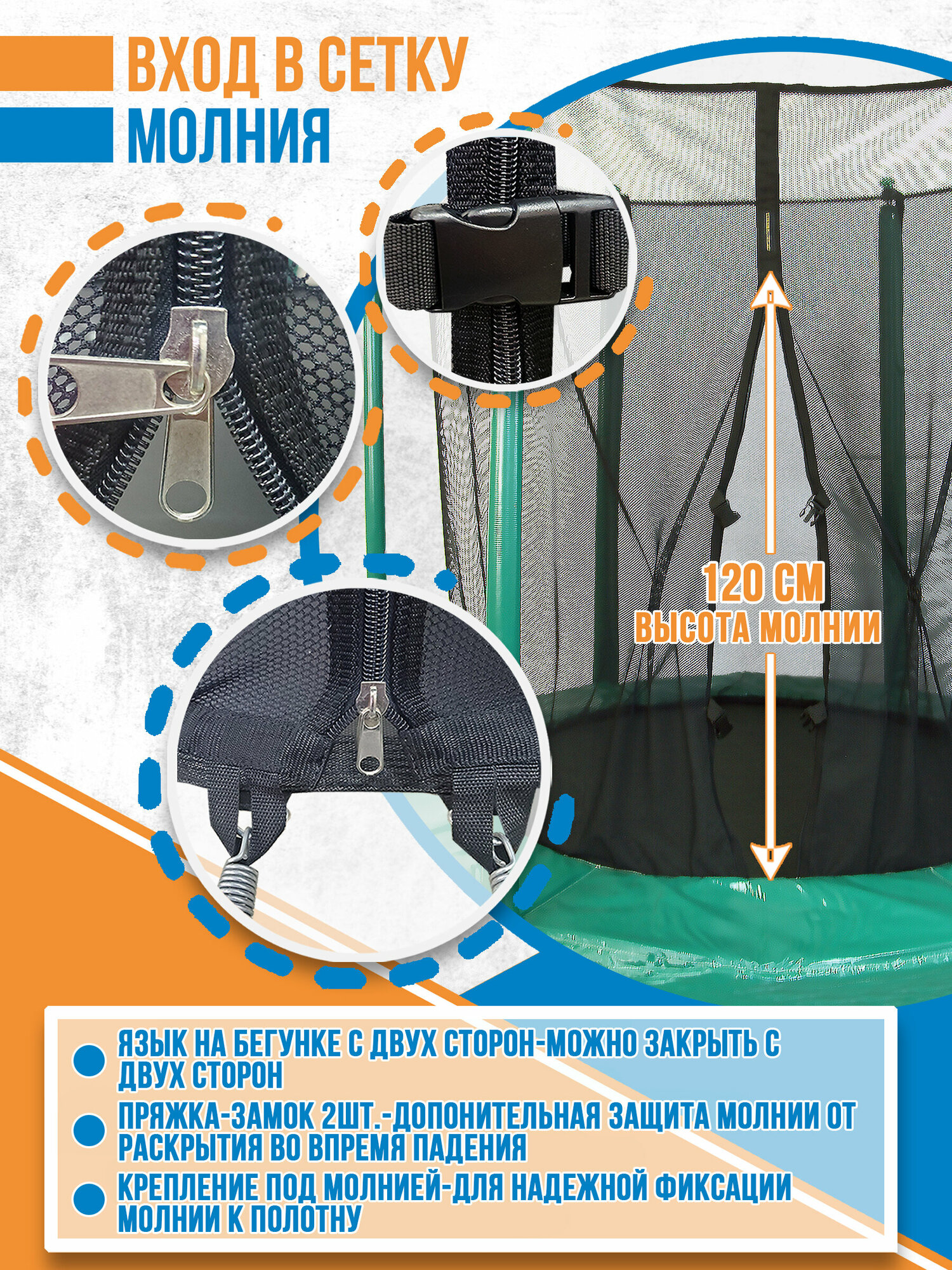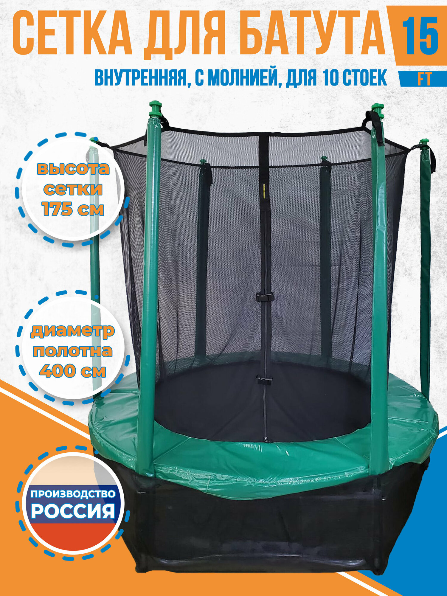 Купить Сетка внутренняя для батута 15 футов - на диаметр прыжкового полотна 400 см, 10 стоек, молния