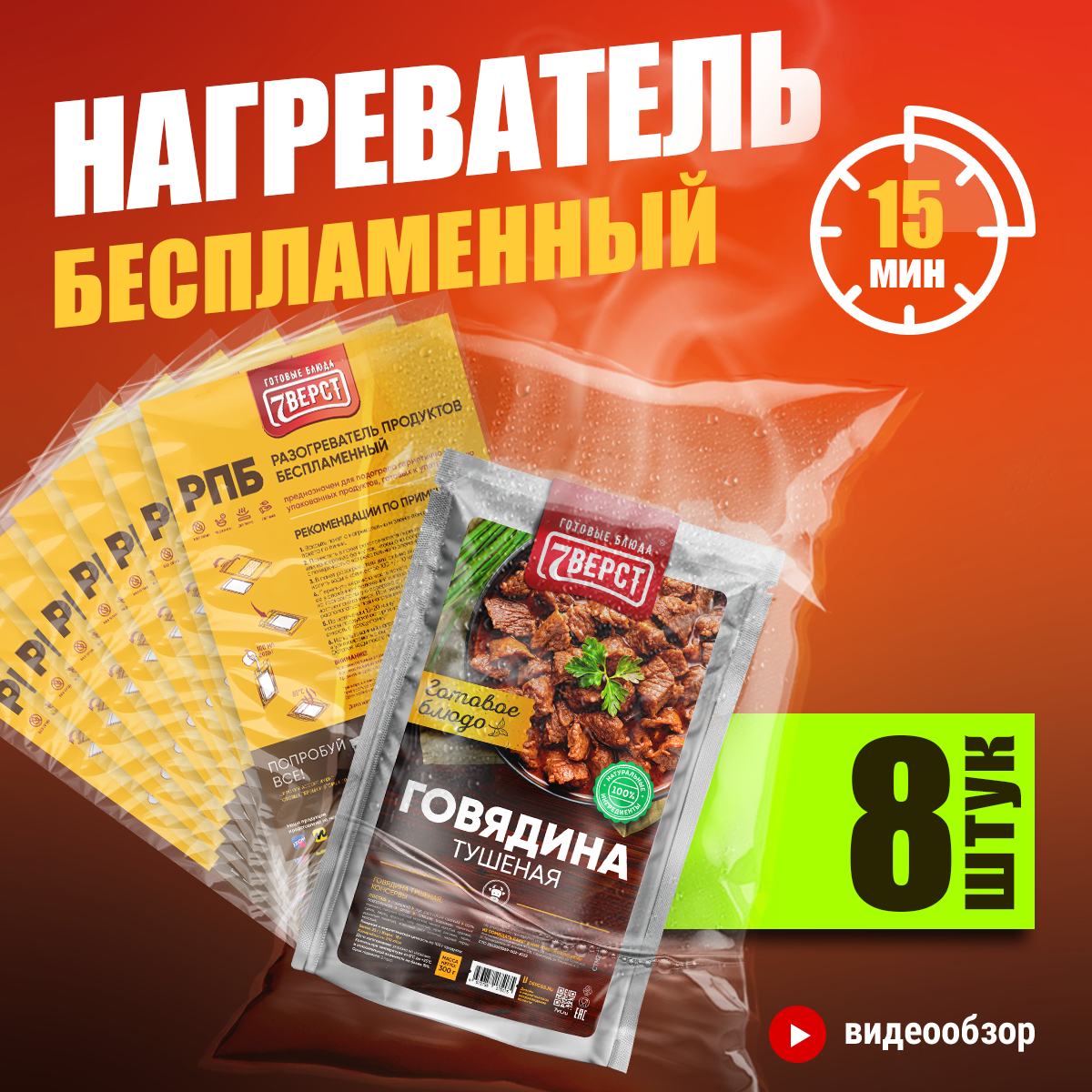 7 Вёрст Беспламенный нагреватель пищи БНП. Для разогрева реторт-пакетов и консервов. Набор - 8 шт.