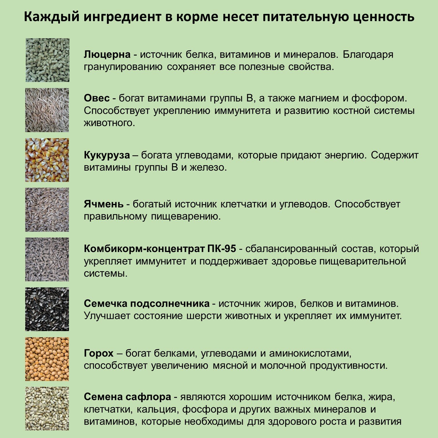 | Состав | овес, кукуруза целая, люцерна (травяная гранула), ячмень, пшеница, комбикорм концентрат (витаминная гранула), семечка подсолнечника |
