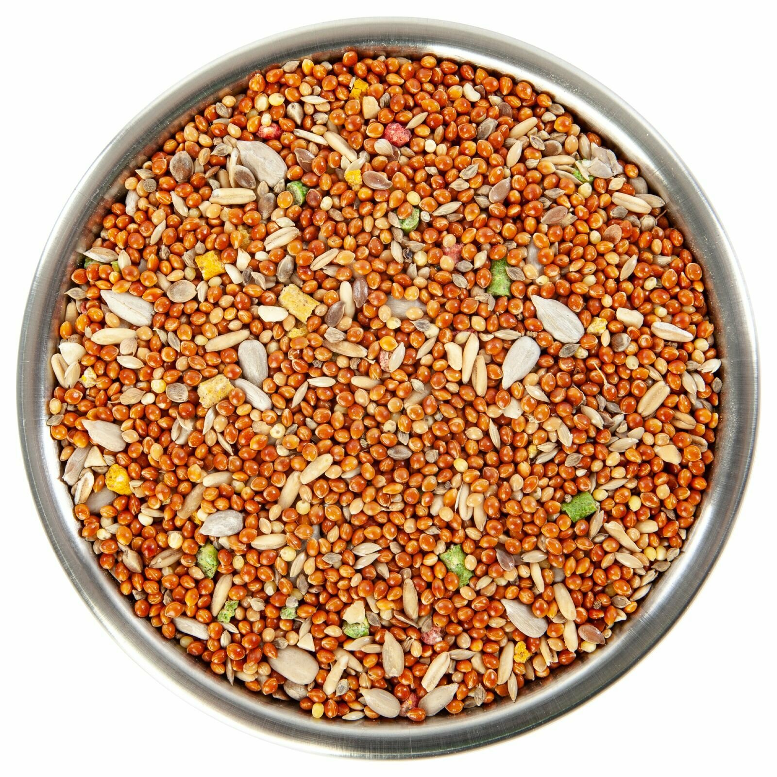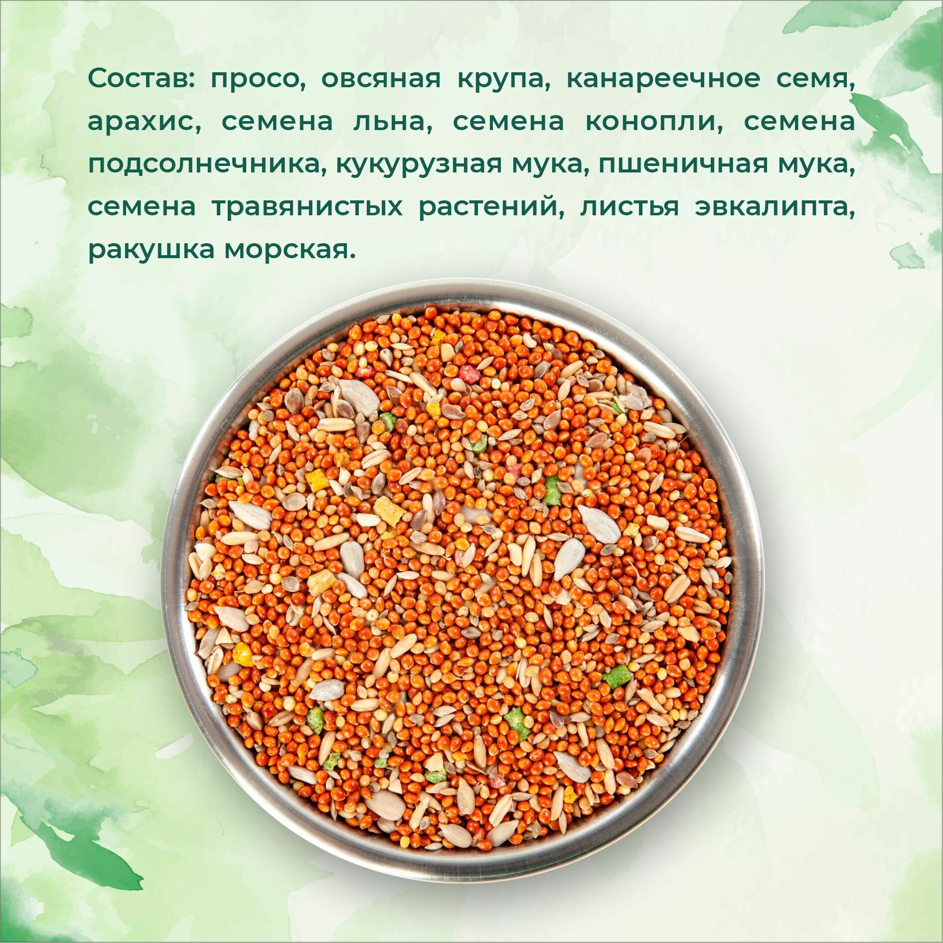 | Состав | просо, овсяная крупа, канареечное семя, арахис, семена льна, семена конопли, семена подсолнечника, кукурузная мука, пшеничная мука, семена травянистых растений, листья эвкалипта, ракушка морская |