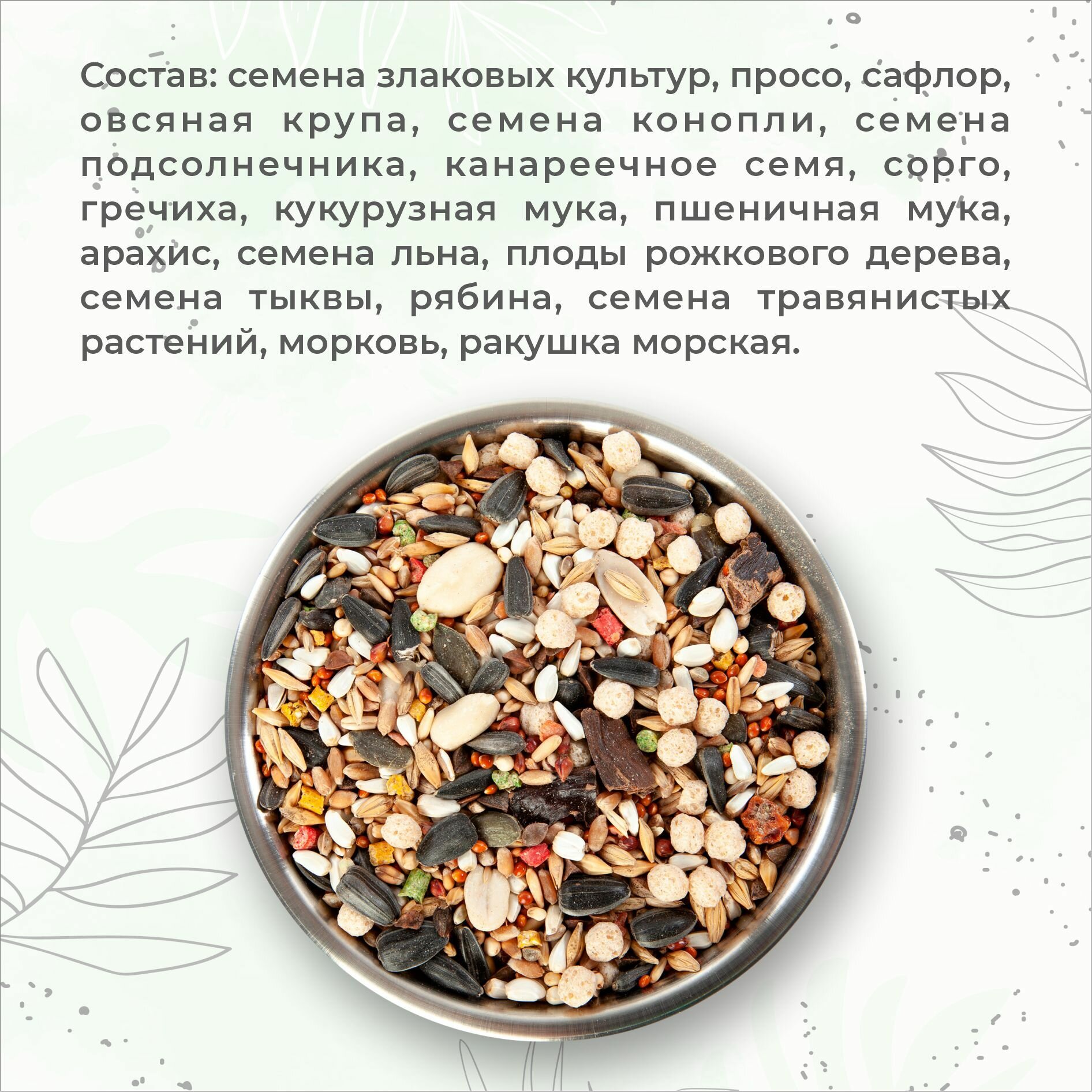| Состав | семена злаковых культур, просо, сафлор, овсяная крупа, семена конопли, семена подсолнечника, канареечное семя, сорго, гречиха, кукурузная мука, пшеничная мука, арахис, семена льна, плоды рожкового дерева, семена тыквы, рябина, семена травянистых растений, морковь, ракушка морская. |