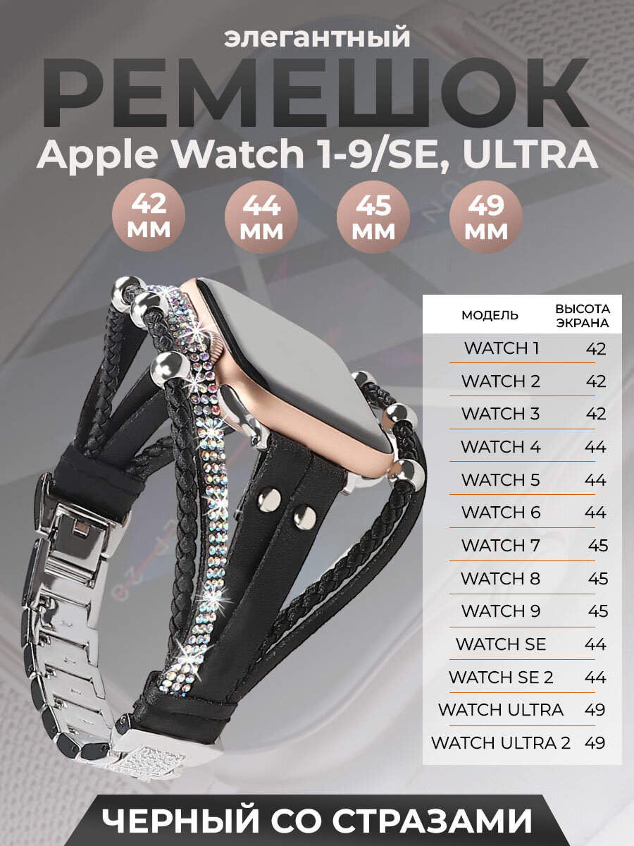 Элегантный ремешок для Apple Watch 1-9 / SE / ULTRA (42/44/45/49 мм), черный со стразами интересное: