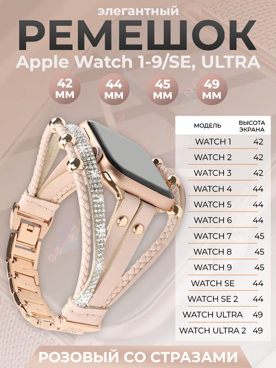 Элегантный ремешок для Apple Watch 1-9 / SE / ULTRA (42/44/45/49 мм), розовый со стразами интересное: