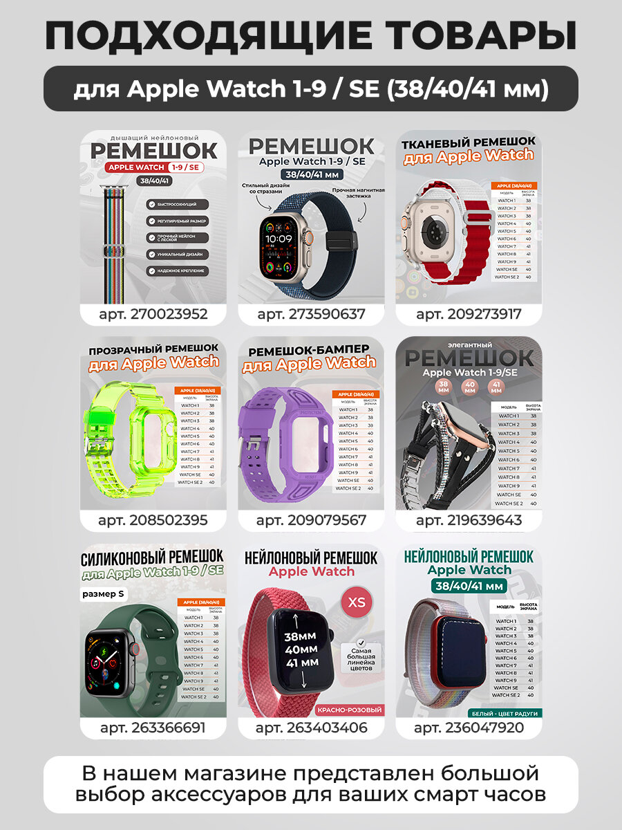 | Совместимые модели умных часов | Apple Watch 38 мм, Apple Watch 40 мм, Apple Watch 41 мм, Apple Watch 2, Apple Watch 3, Apple Watch 4, Apple Watch 5, Apple Watch 6, Apple Watch 7, Apple Watch 8, Apple Watch 9, Apple Watch SE |