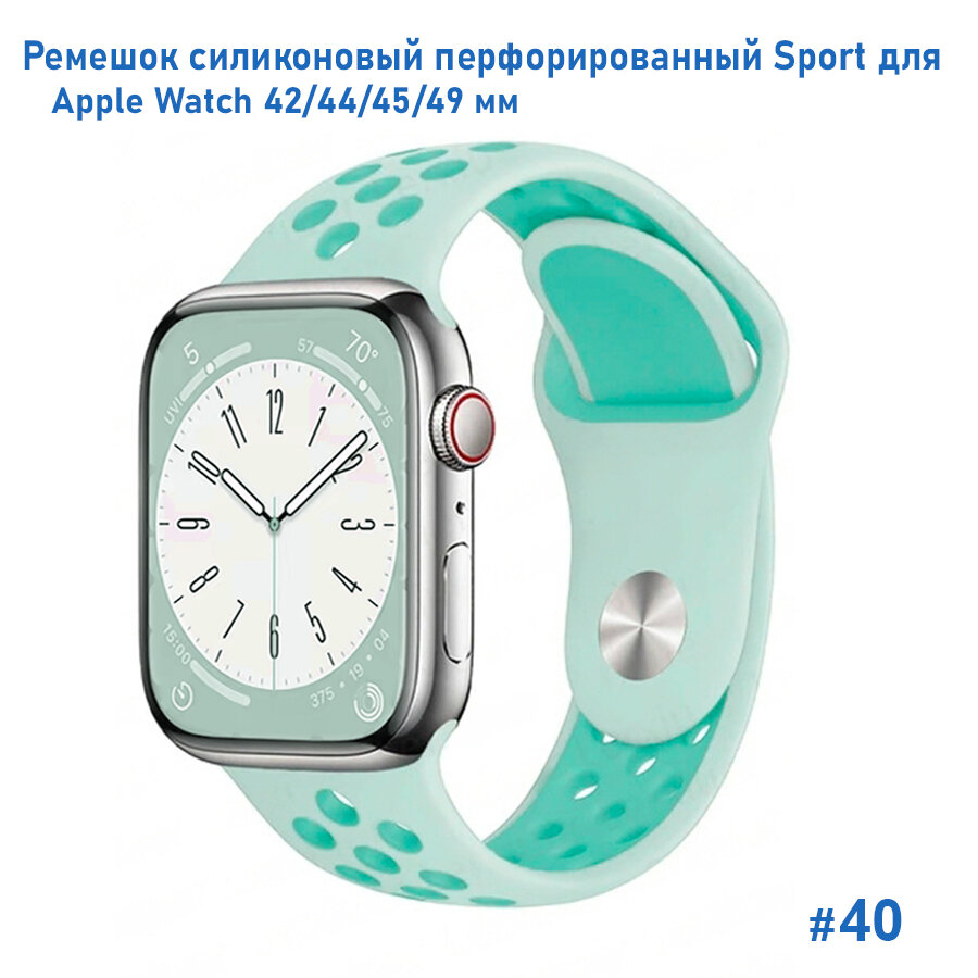 Купить Ремешок силиконовый перфорированный Sport NK для Apple Watch 42/44/45/49 мм, на кнопке, бледно-бирюзовый+мятный (40)
