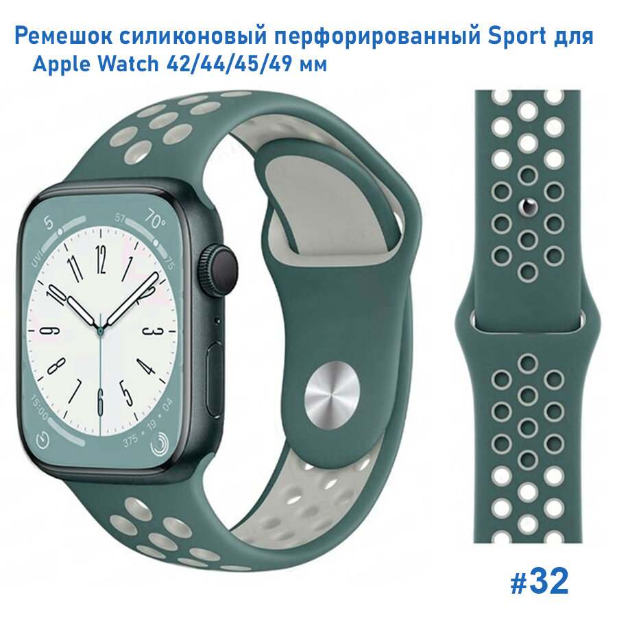 Купить Ремешок силиконовый перфорированный Sport NK для Apple Watch 42/44/45/49 мм, на кнопке, зеленый кактус+серый (32)