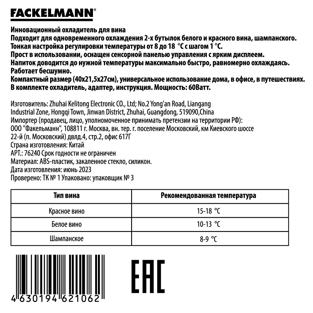 Охладитель для вина Fackelmann для 2-х бутылок, 39.8 х 21.5 х 27см интересное: