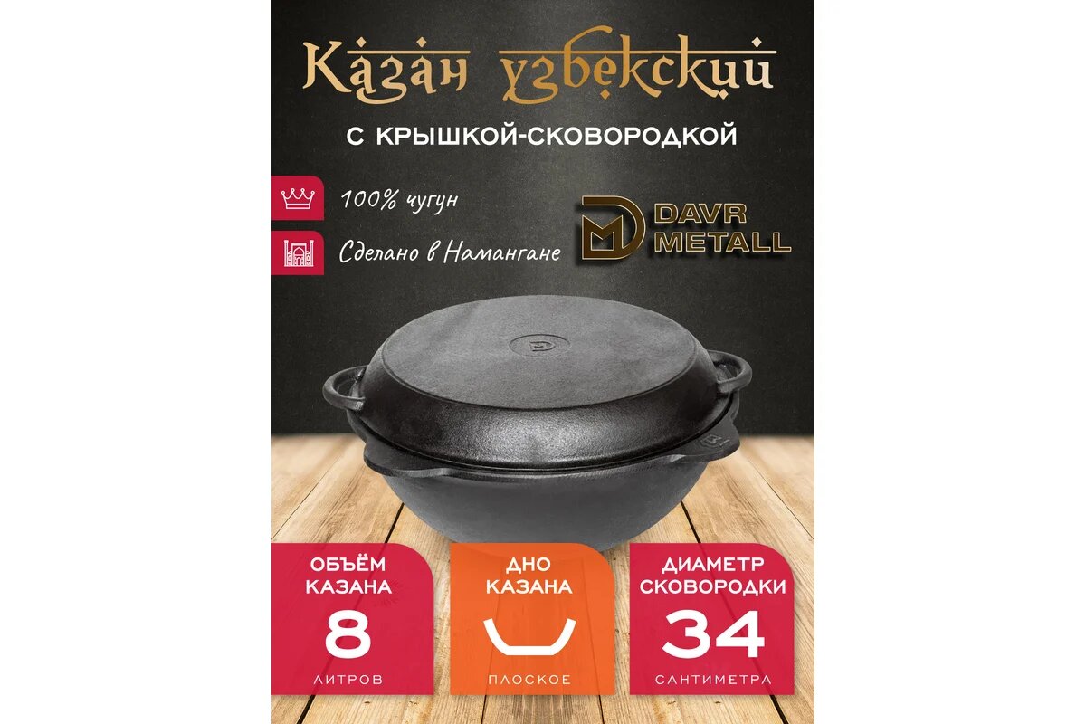 Казан с крышкой сковородкой 8 л (плоское дно) чугунный узбекский DavrMetall интересное: