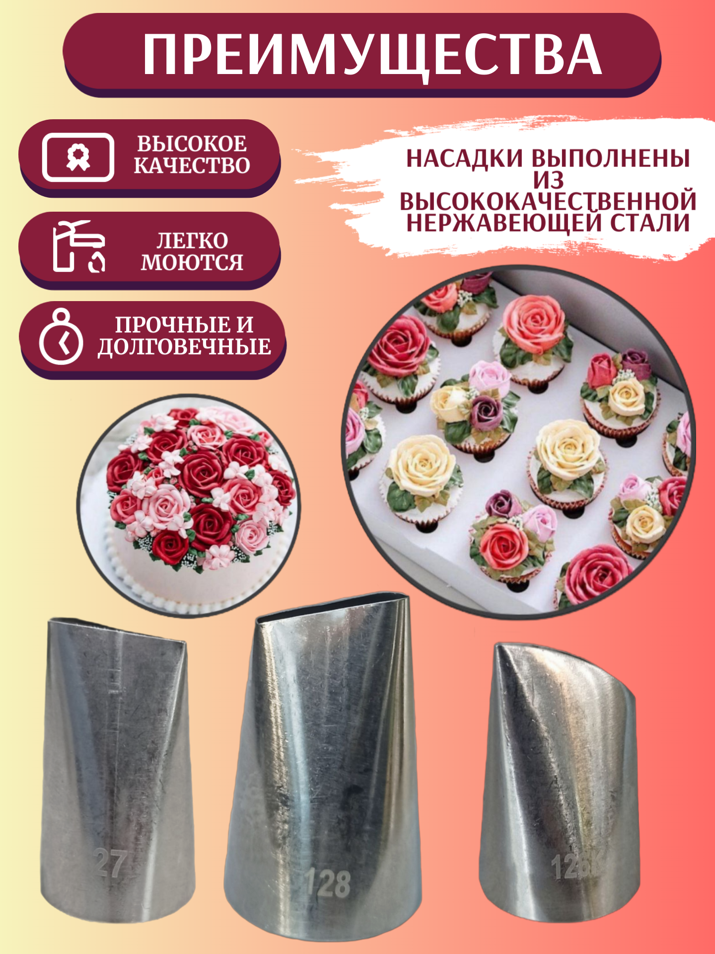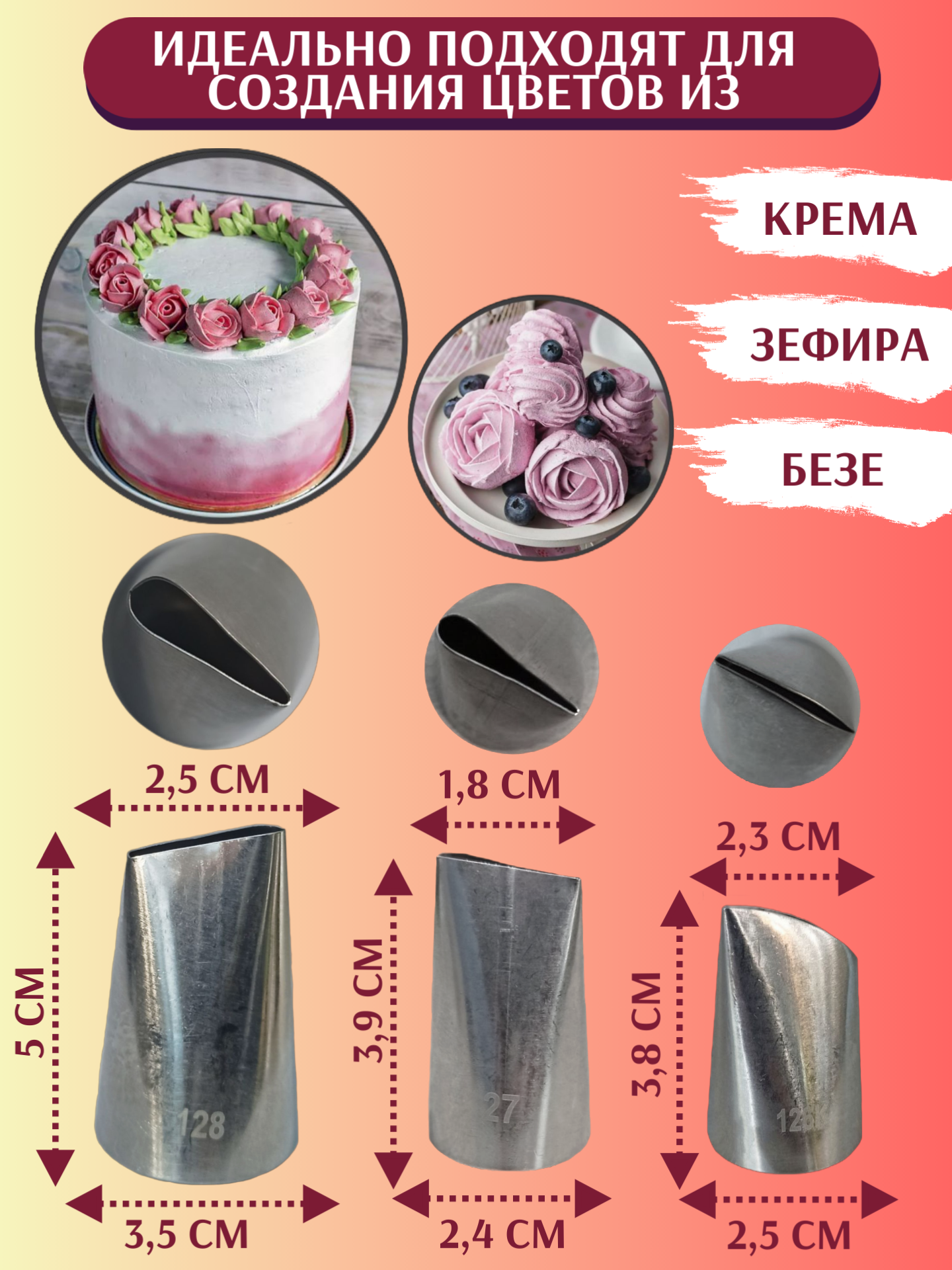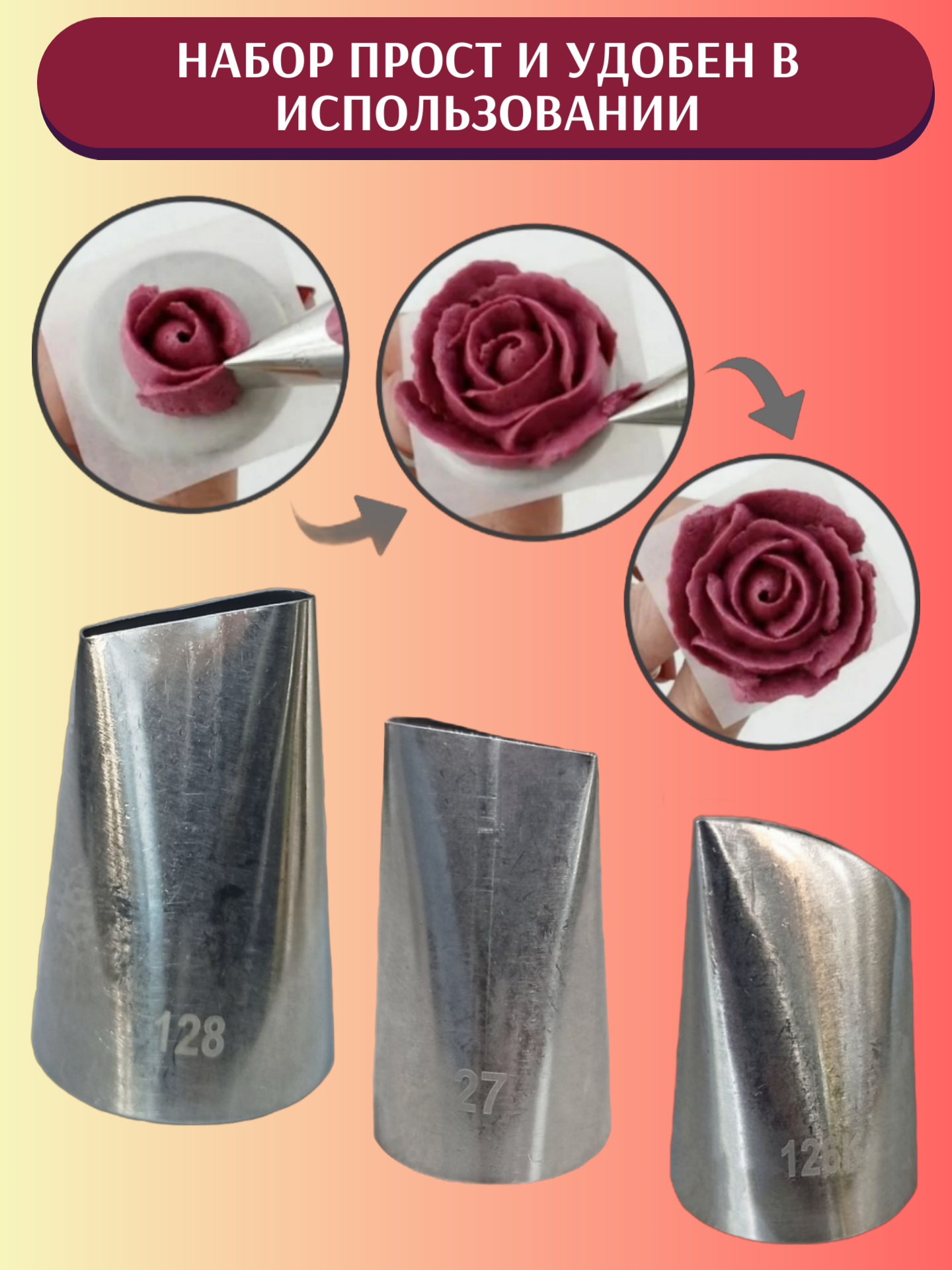 Набор кондитерских насадок для создания цветов из крема "Розы" (Кондитерская насадка Лепесток Розы 128, 127, 126К) интересное: