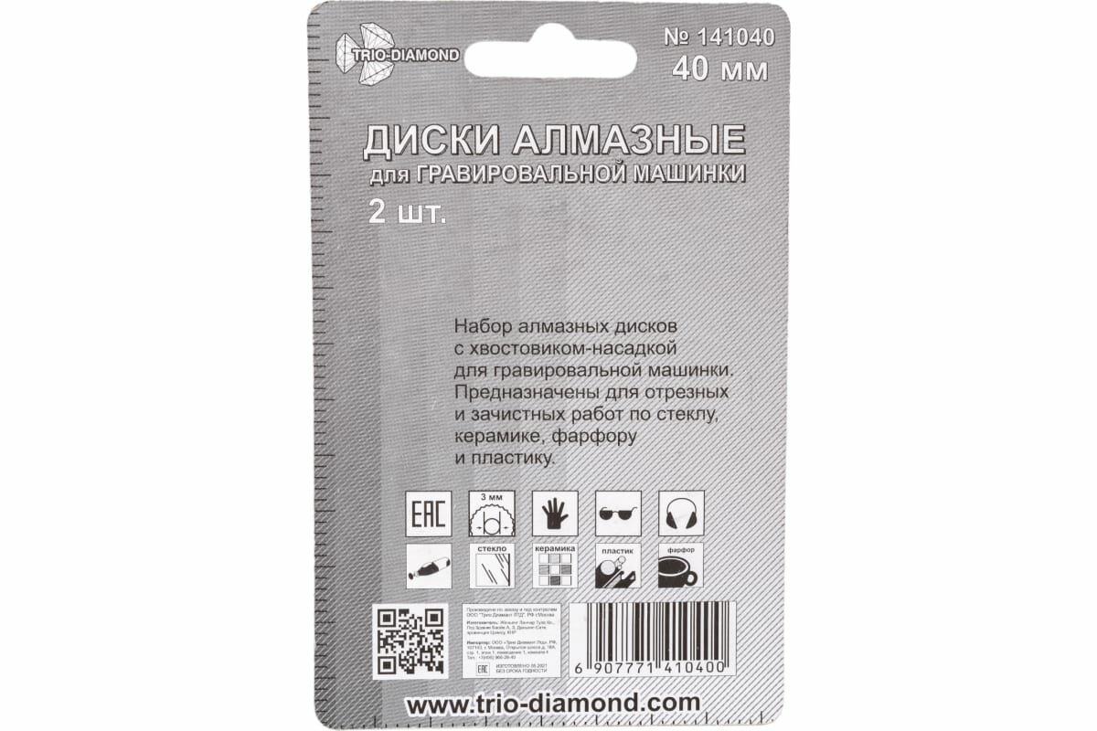 | Дополнительная информация | Диски алмазные 40 мм для гравировальной машинки, 14104 - 2шт |