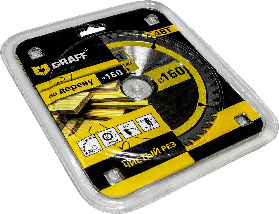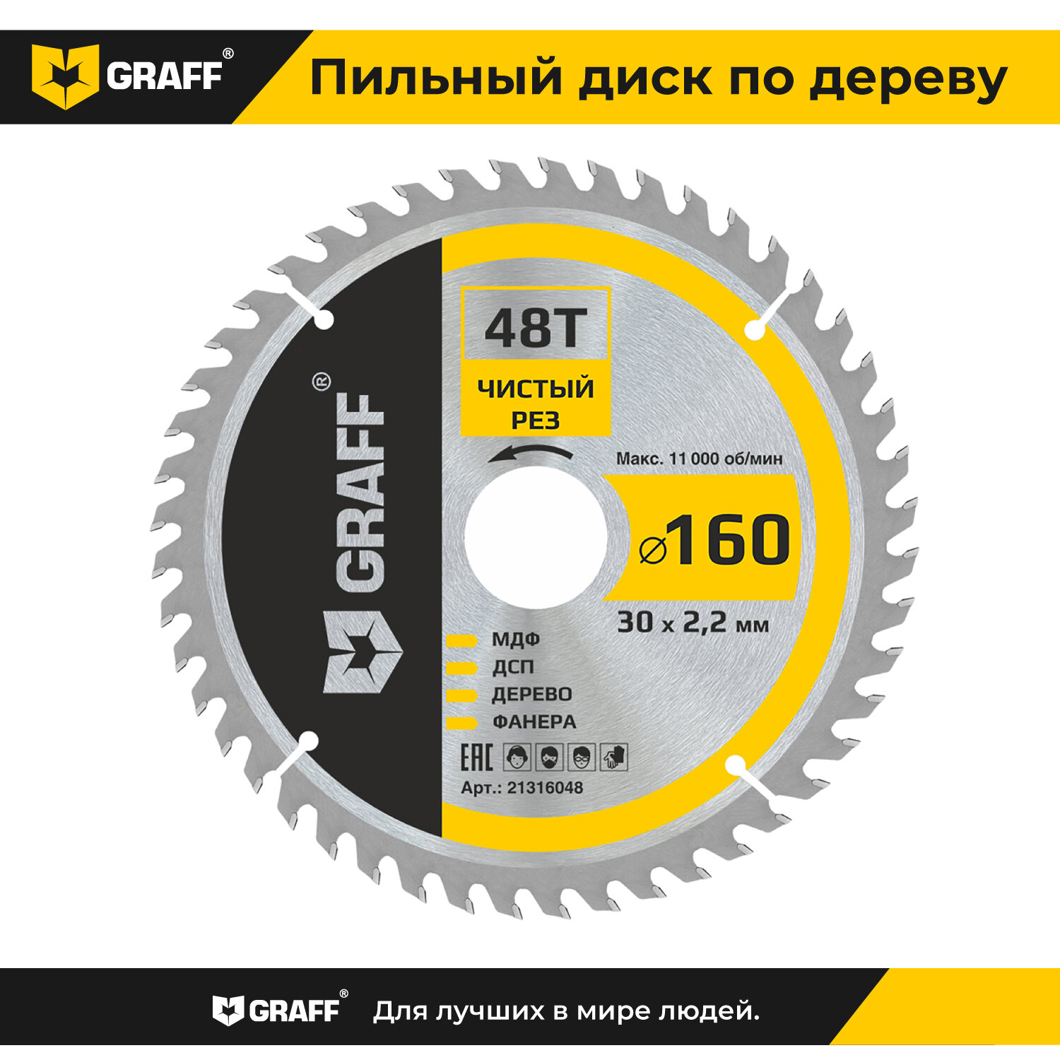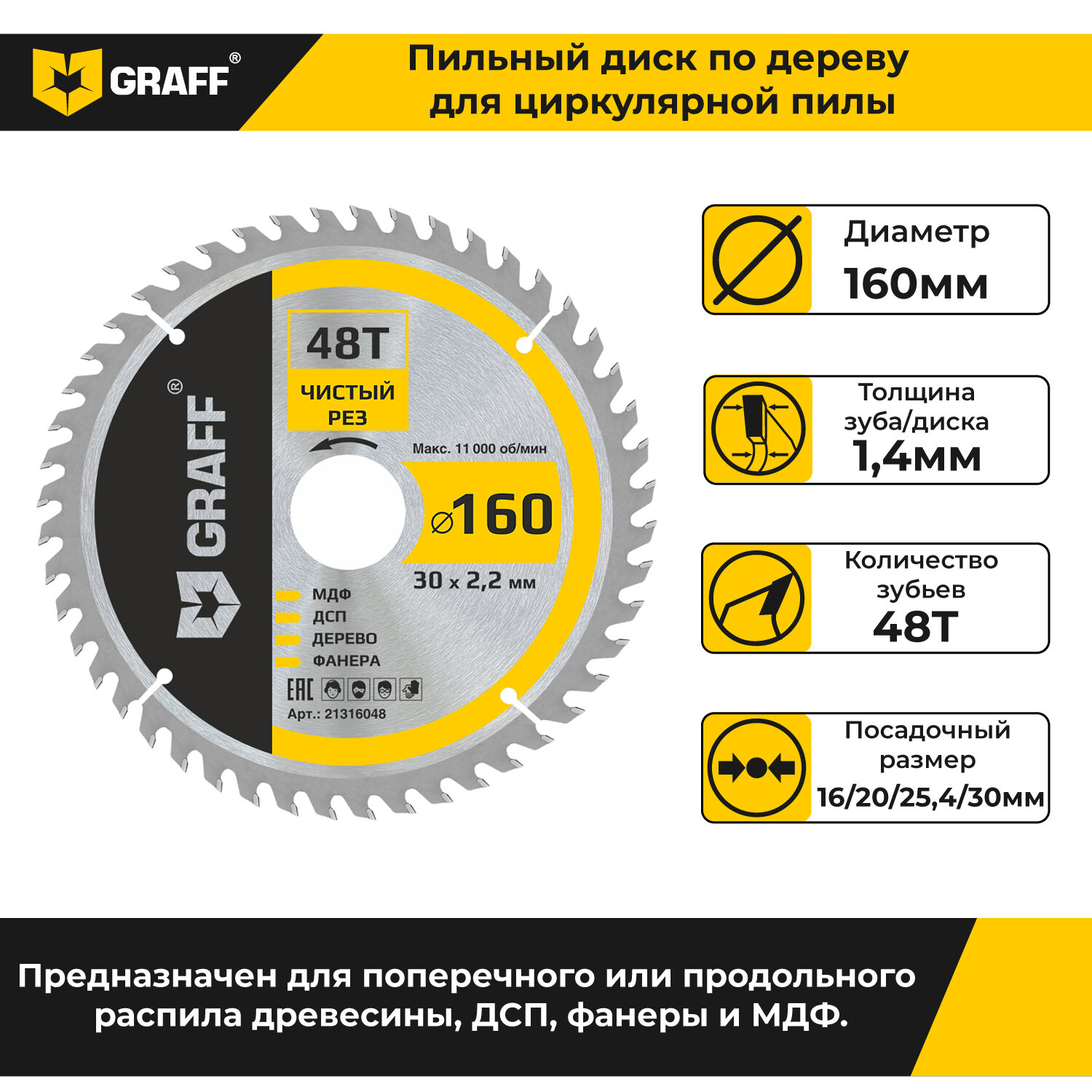 Пильный диск по дереву 160х1,4/2,2х30/25,4/20/16х48Т чистовая обработка GRAFF интересное: