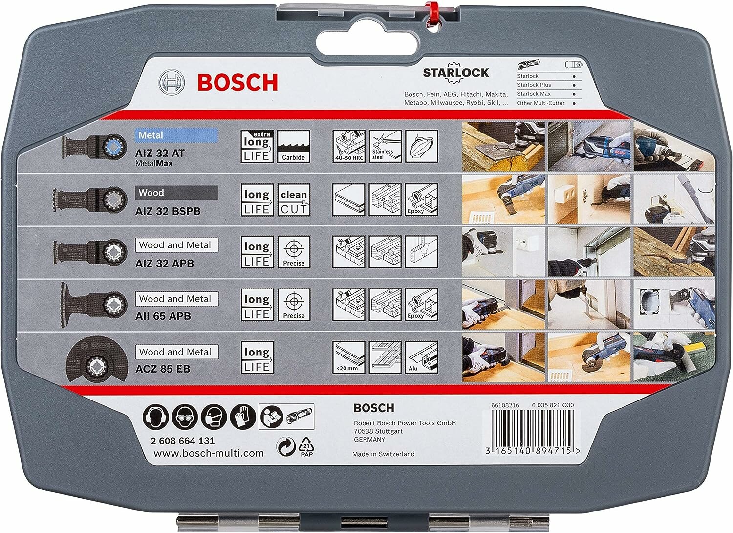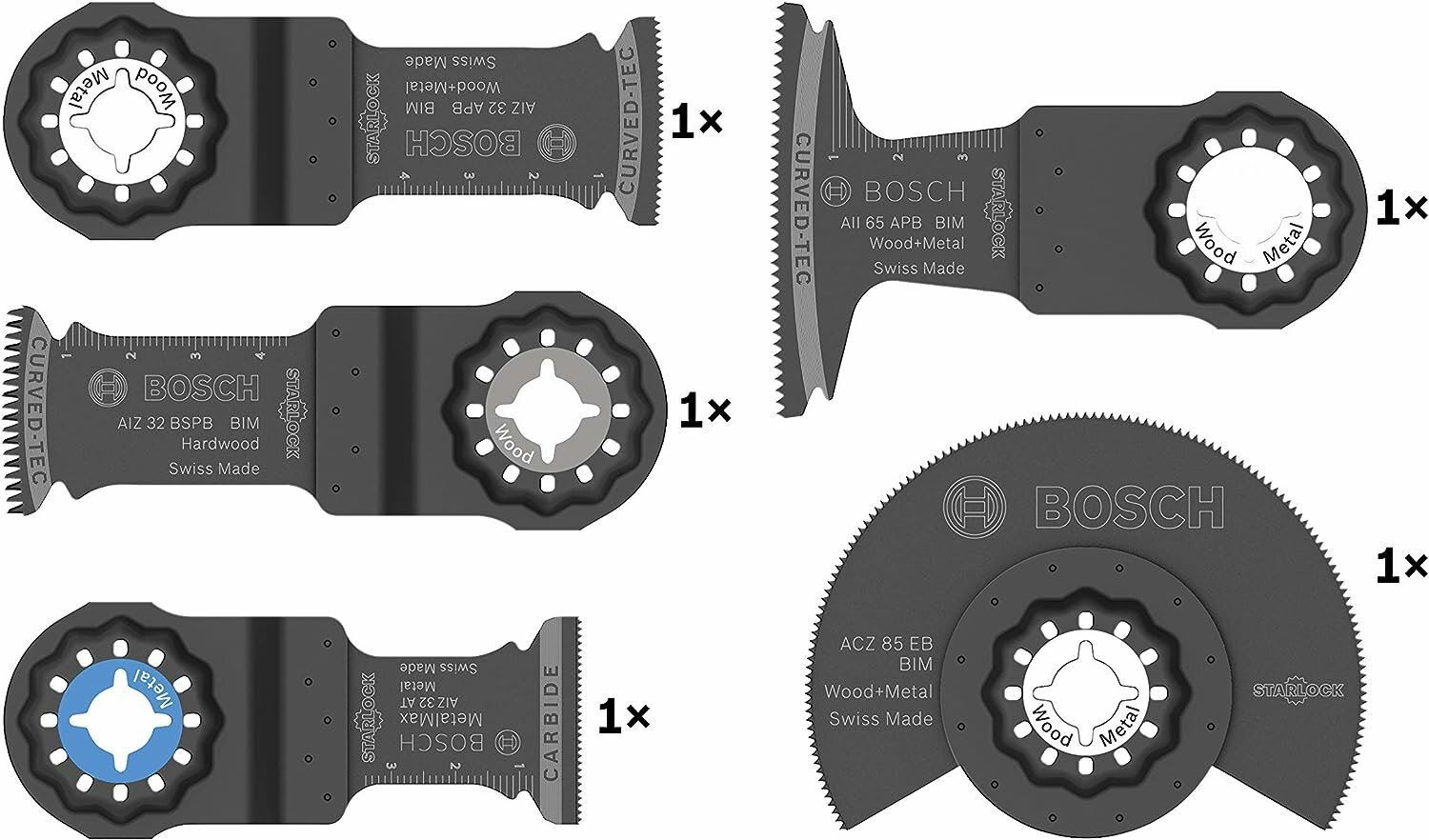 | Состав набора | Погружное пильное полотно по дереву AIZ 32 BSPB; Погружное пильное полотно по древесине и металлу AIZ 32 APB; Сегментированный пильный диск по дереву и металлу ACZ 85 EB; Погружное твердосплавное пильное полотно по металлу AIZ 32 AT; Погружное пильное полотно по дереву и металлу AII 65 APB. |