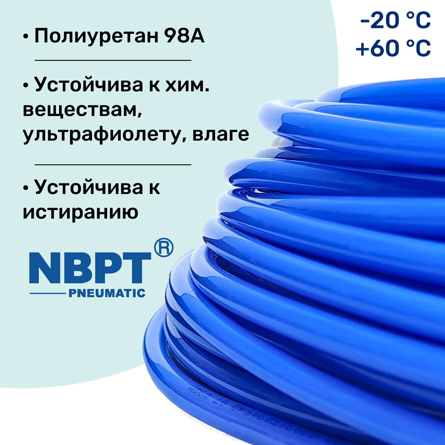 Трубка пневматическая полиуретановая 98A 10х6,5мм - 100м, маслобензостойкая, воздушная, Пневмошланг NBPT, Синяя
