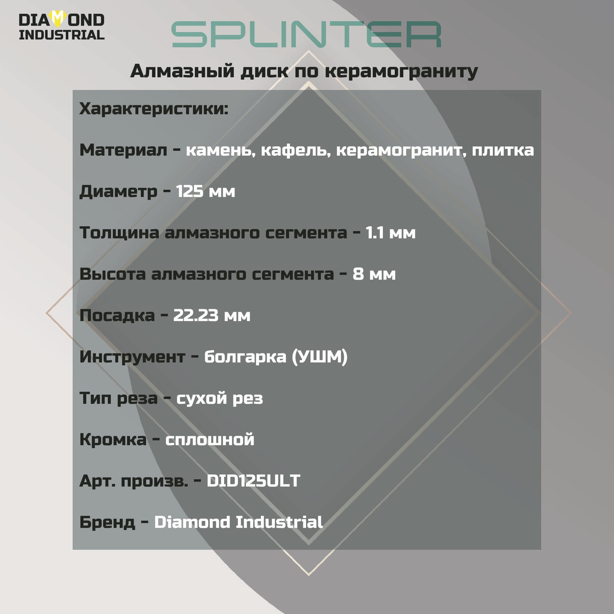 СохранитьАлмазный диск по керамограниту 125 мм Splinter Diamond Industrial, ультратонкий интересное: