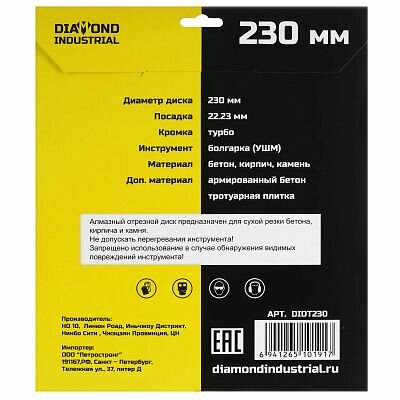 Ниже Вы можете прочитать отзывы на Алмазный диск по бетону, кирпичу, камню турбо 230 мм Diamond Industrial, ознакомится с подробными характеристиками, посмотреть интересные обзоры и фотографии на Алмазный диск по бетону, кирпичу, камню турбо 230 мм Diamond Industrial.