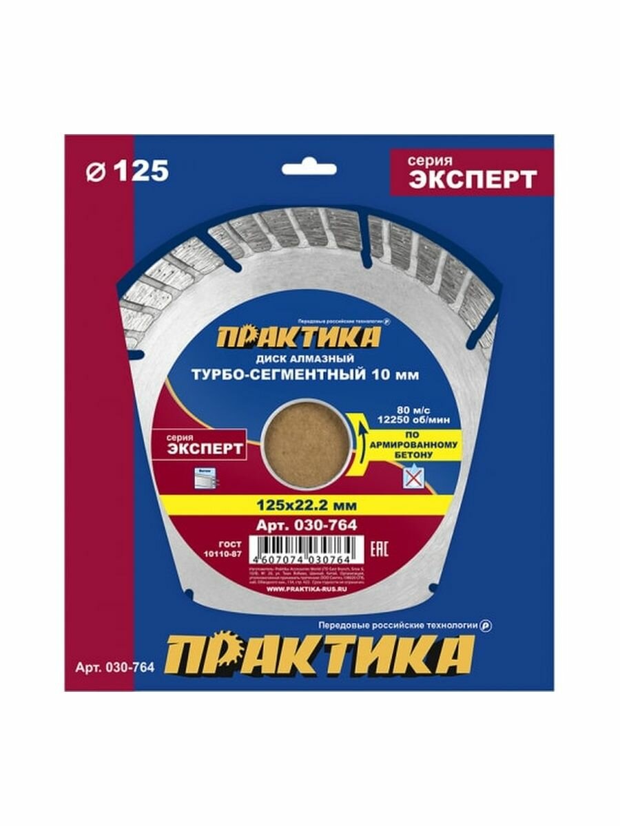 Диск алмазный турбосегментный ПРАКТИКА "Эксперт-бетон" 125 х 22 мм, сегмент 10мм (1 шт.) к (030-764)