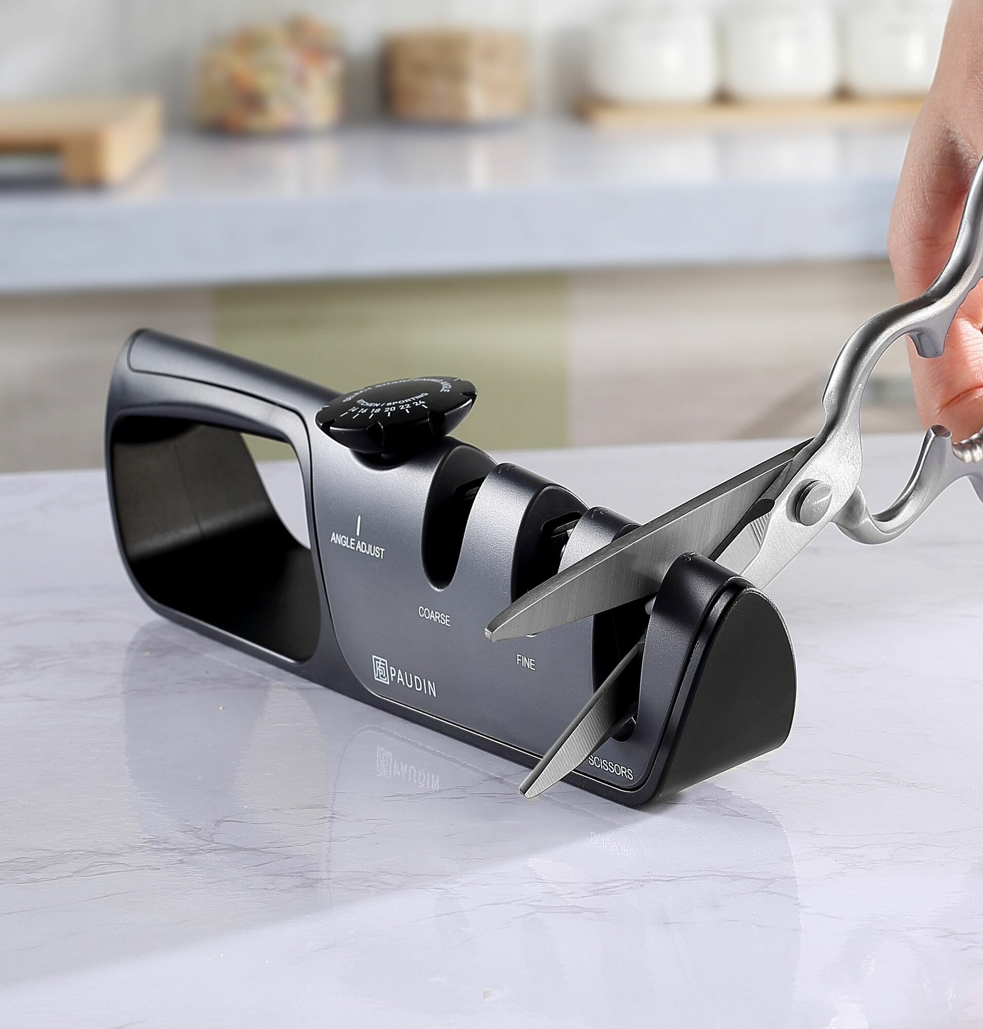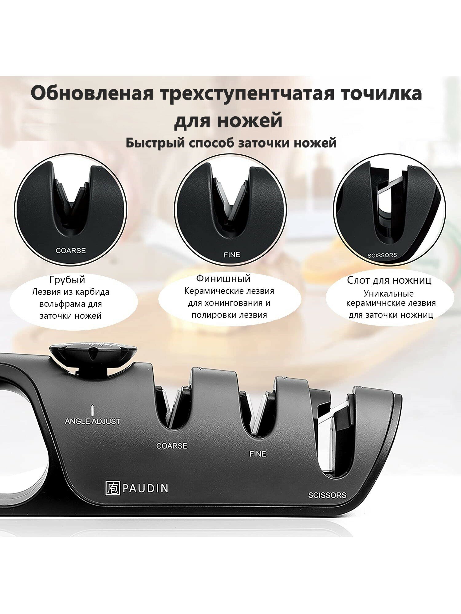 PAUDIN Pro / Точилка для ножей и ножниц ножеточка ручная настольная, механическая, трехступенчатая, регулируемая