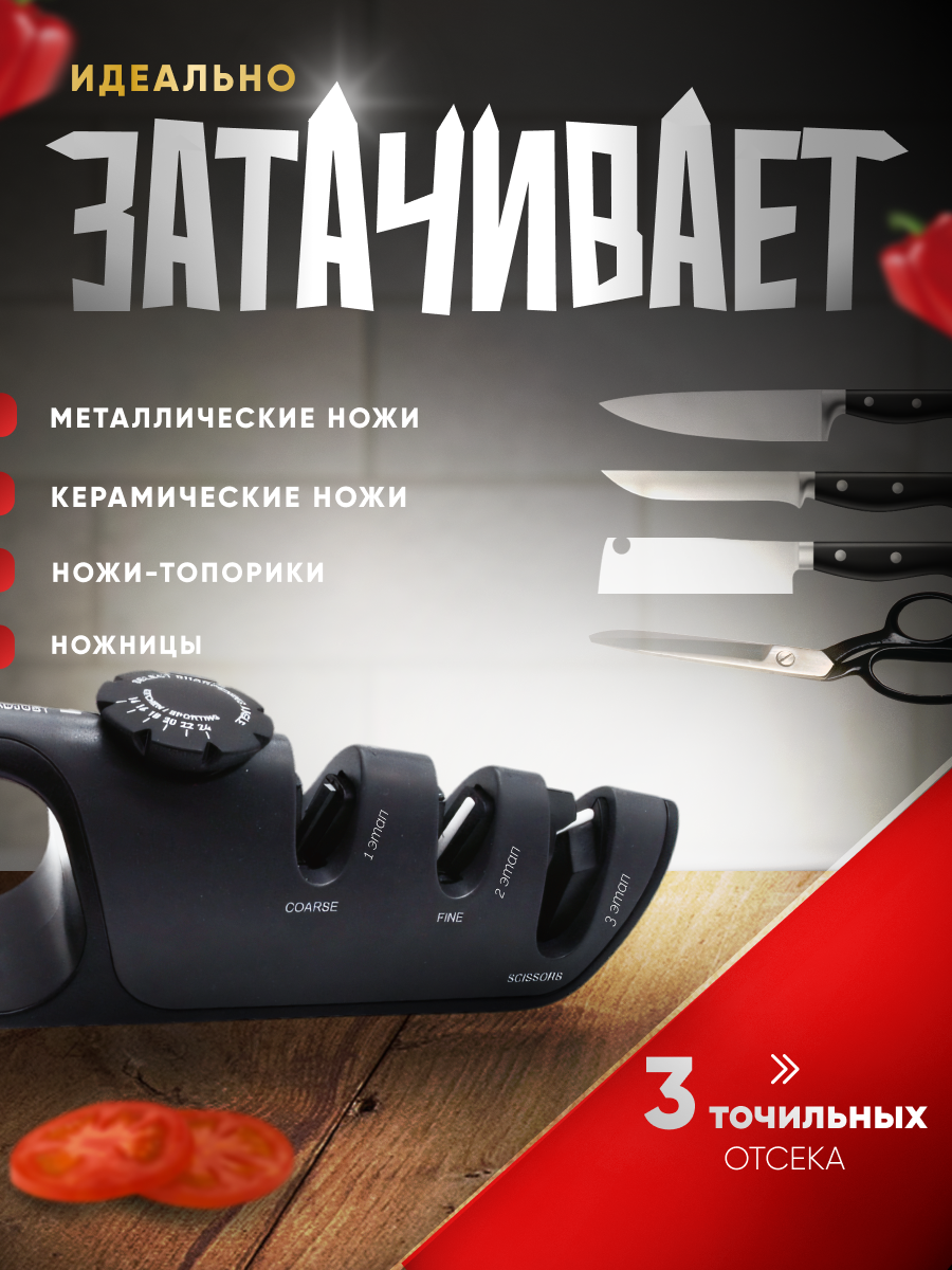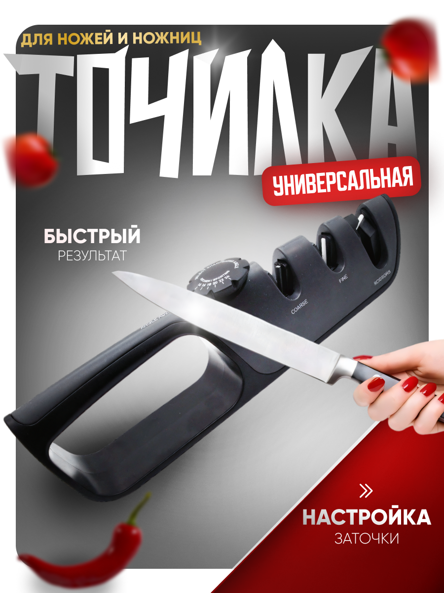 Точилка для ножей и ножниц ножеточка ручная настольная, механическая, трехступенчатая, регулируемые углы заточки для разных видов ножей