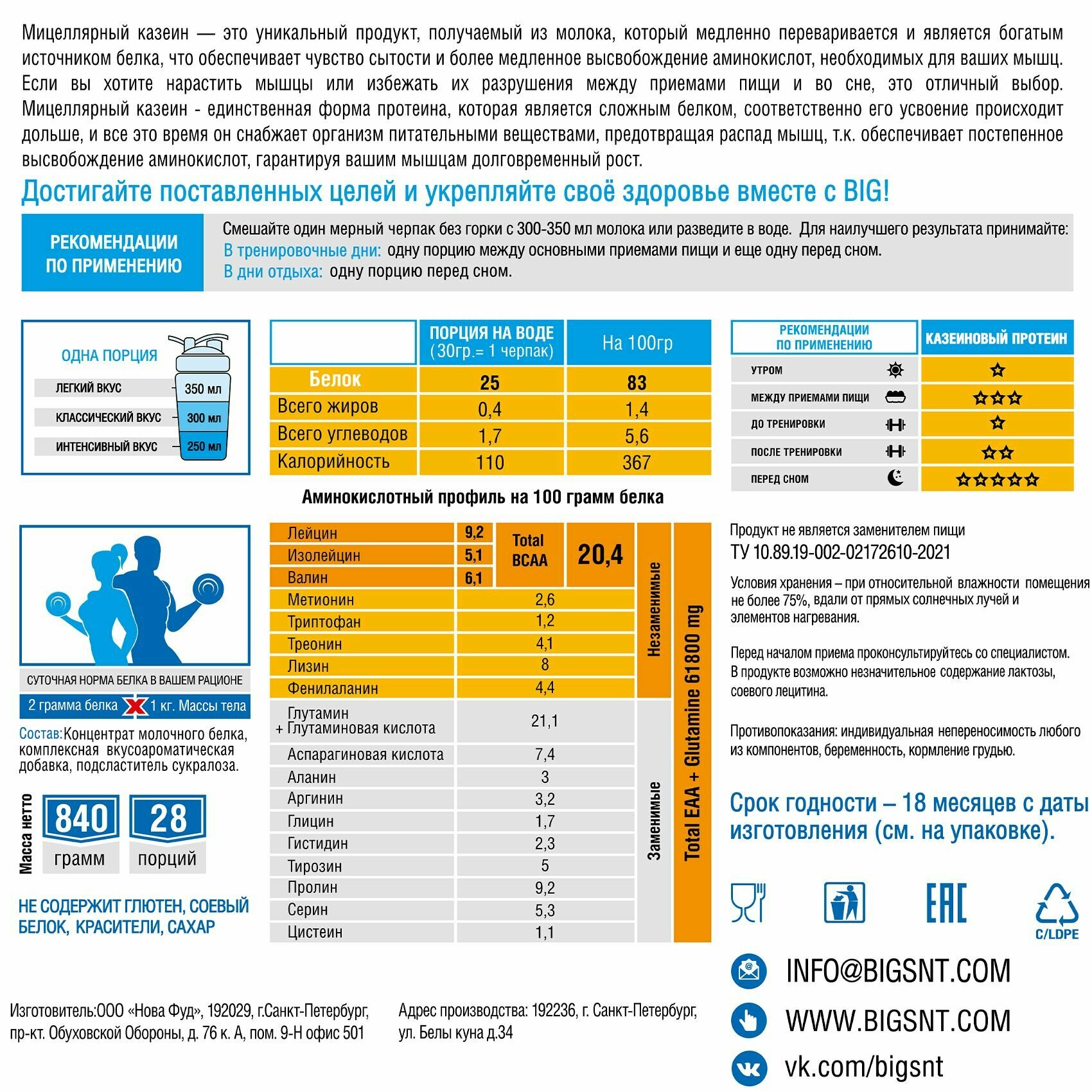 | Состав | Содержание питательных веществ на порцию продукта (30 грамм = 1 черпак): Белки - 25 гр. Жиры - 0,4 гр. Углеводы - 1,7 гр. Калорийность - 110 ккал Содержание питательных веществ на 100 грамм продукта: Белки - 83 гр. Жиры - 1,4 гр. Углеводы - 5,6 гр. Калорийность - 367 ккал Состав: Концентрат молочного белка, комплексная вкусоароматическая добавка, подсластитель сукралоза. Не содержит глютена, соевого белка, сахара, красителей. |