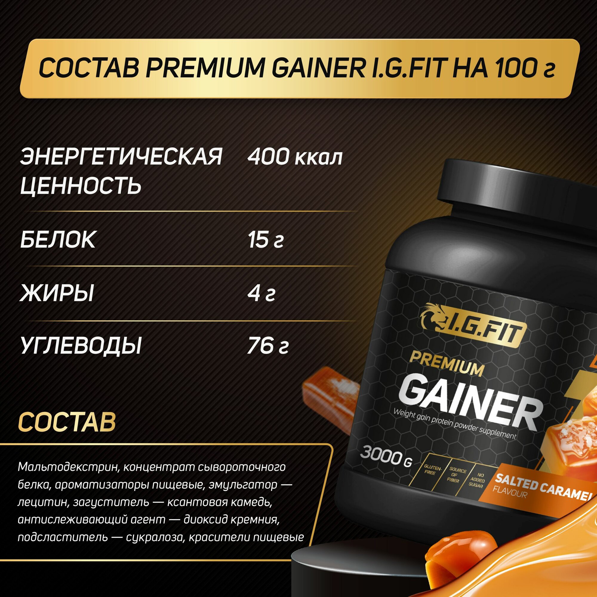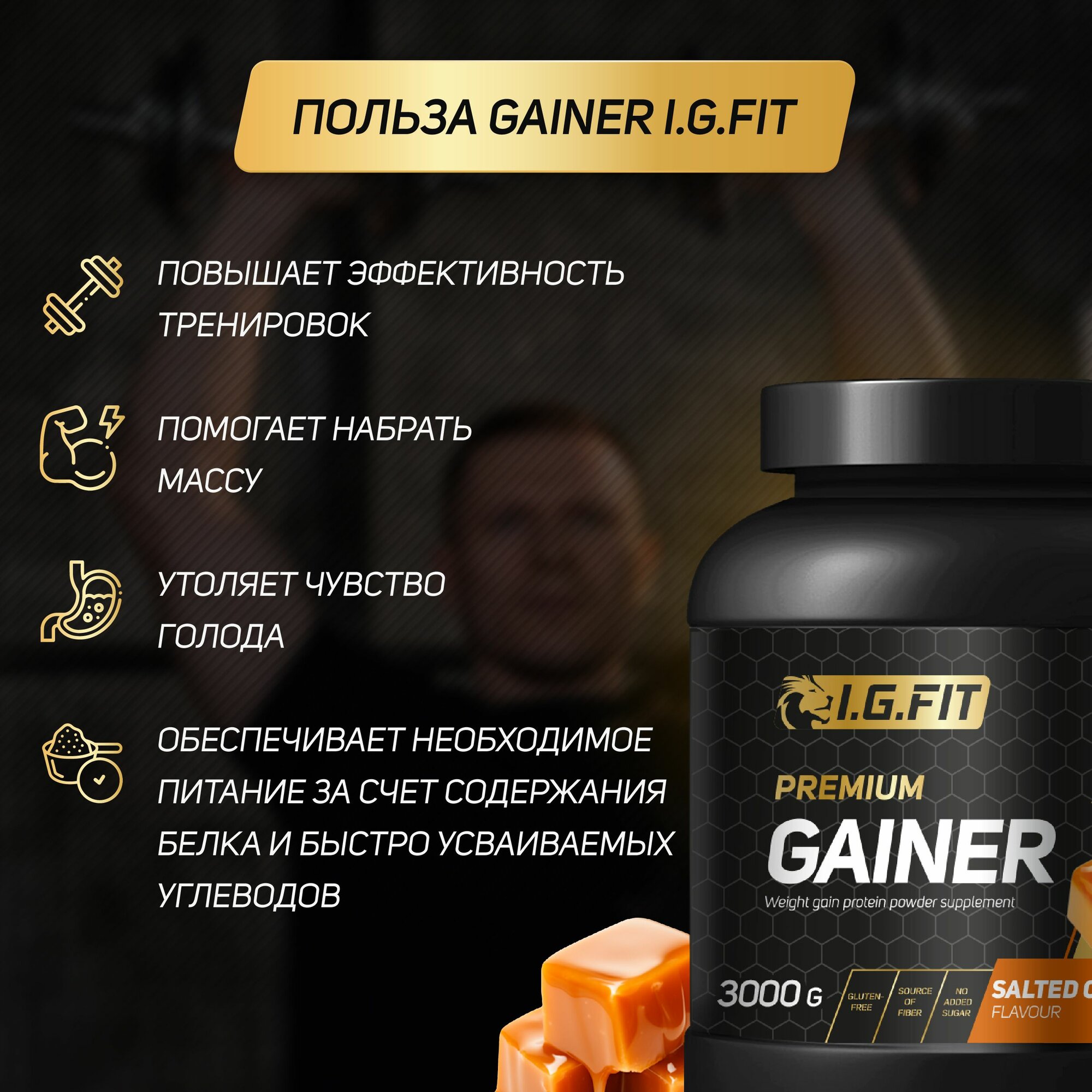 Гейнер I.G.FIT, соленая карамель, 3000 г (для набора мышечный массы, для похудения, для спорта, с мерной ложкой) интересное: