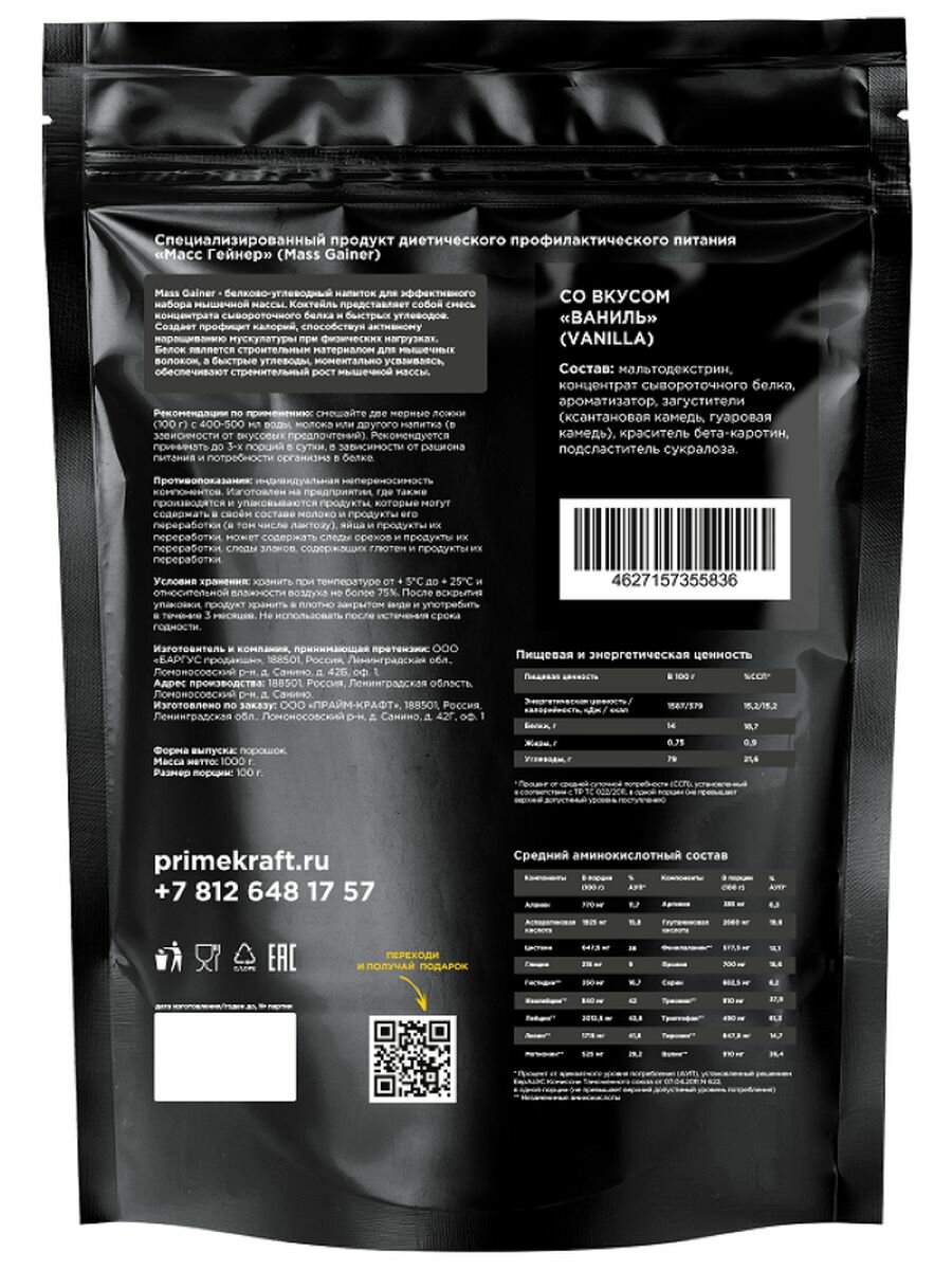 Прайм крафт, Гейнер белково-углеводный Ваниль 1000 гр интересное: