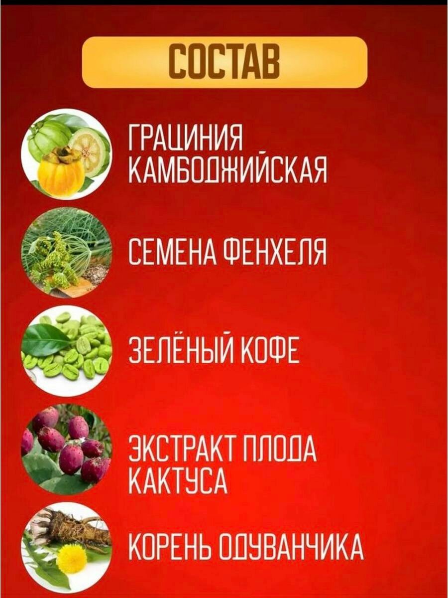 | Состав | гарциния камбоджийская, зеленый кофе, корень одуванчика, листья ясеня, плоды кактуса, семена фенхеля, семена черного тмина, цветы гибискуса, черный чай |