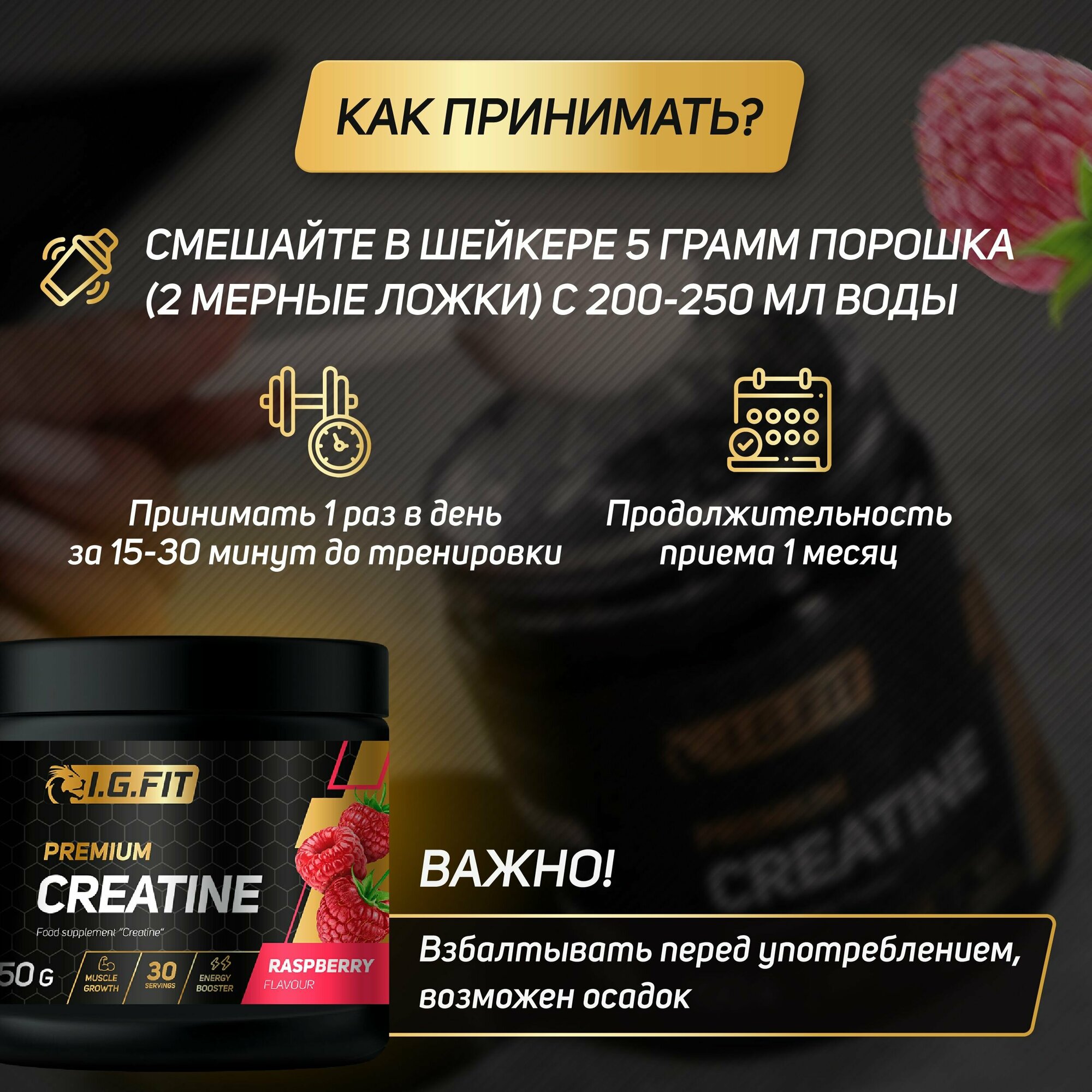 Купить Креатин моногидрат I.G. FIT, со вкусом малина 150 г (спортивное питание для сушки, порошок для набора мышечной массы, creatine monohydrate с мерной ложкой)