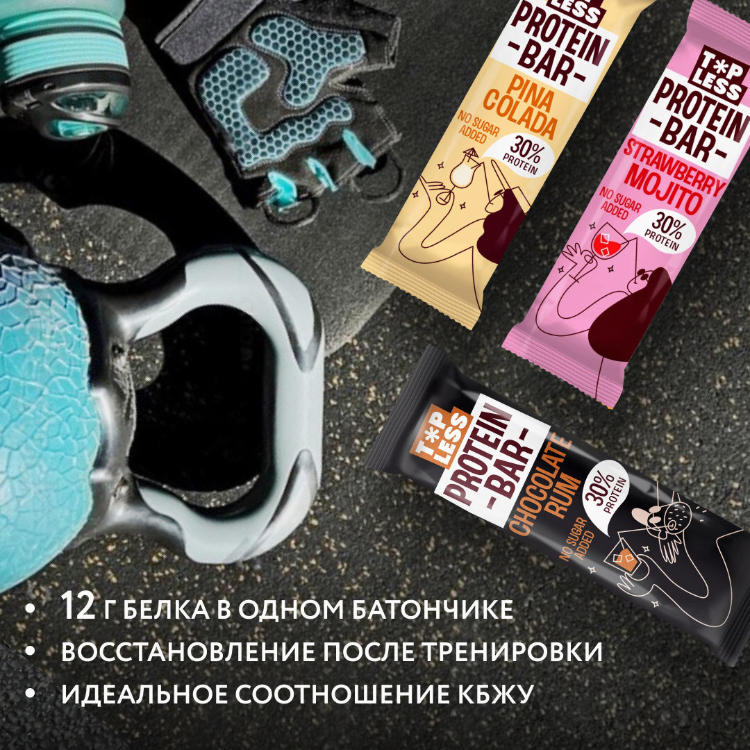 Протеиновые батончики FitnesSHOCK без сахара Ассорти COCKTAIL TopLess (Шоколад и ром, клубника и мята, пинаколада), батончики протеиновые, 40гр 12 шт интересное: