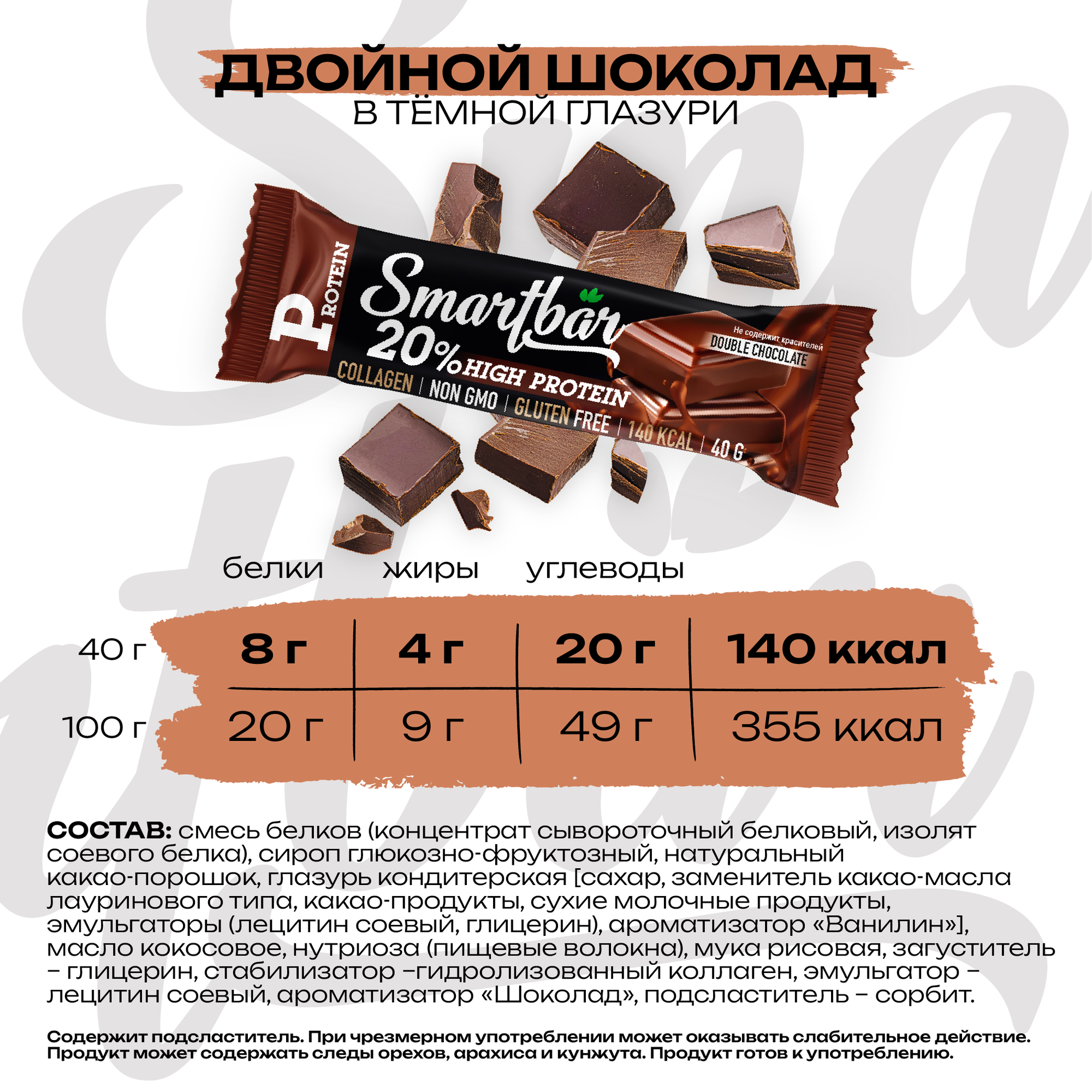 Протеиновые батончики SmartBar Protein 20% "Двойной шоколад в темной глазури" 40г (12шт)