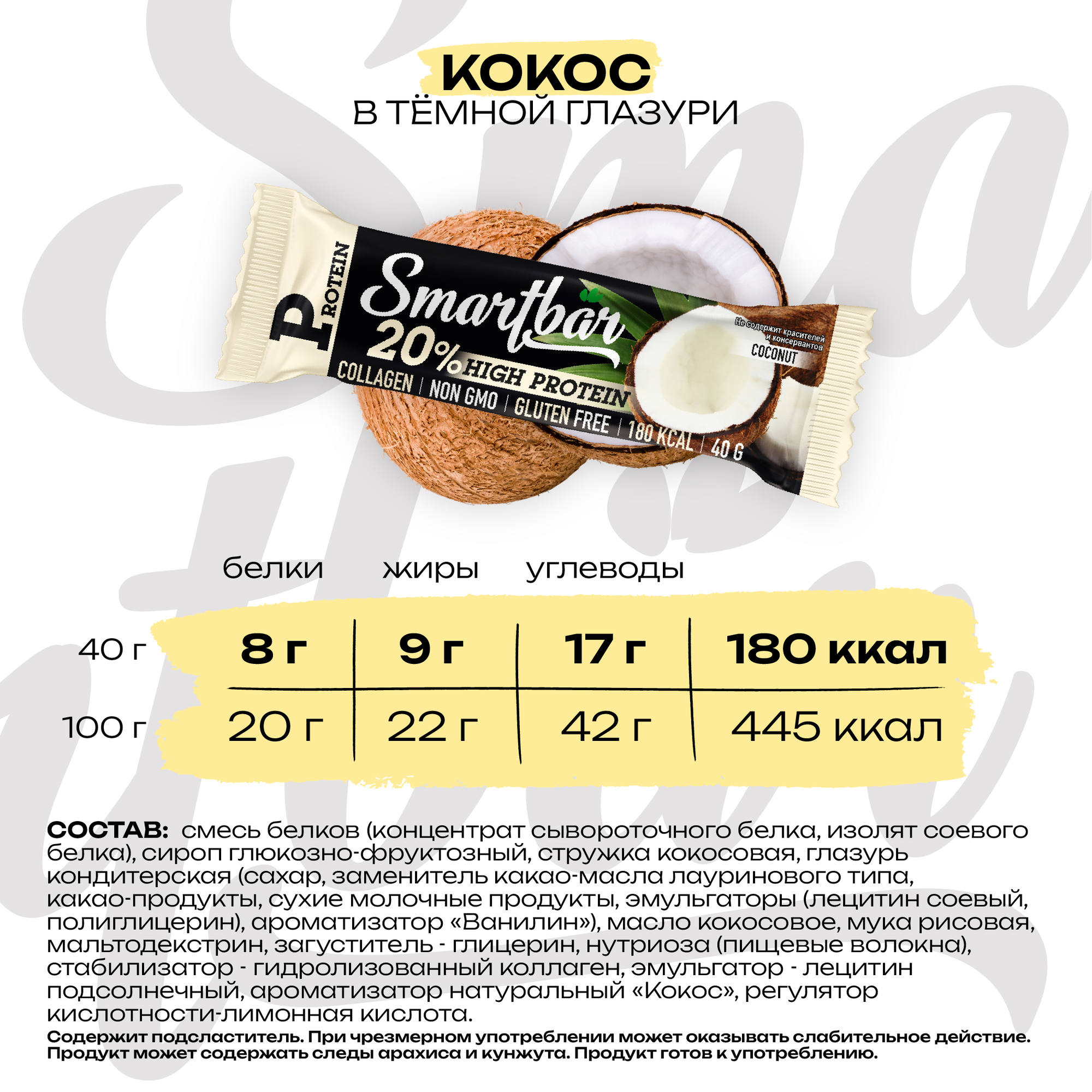 Протеиновые батончики "Кокос в темной глазури" Protein 20% SmartBar, 40г (12шт)