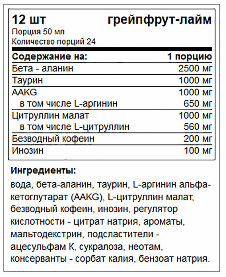 | Основные ингредиенты | аргинин / бета-аланин / кофеин / таурин |