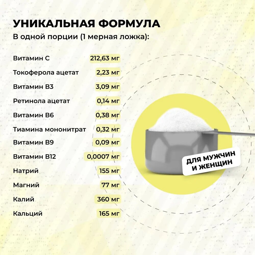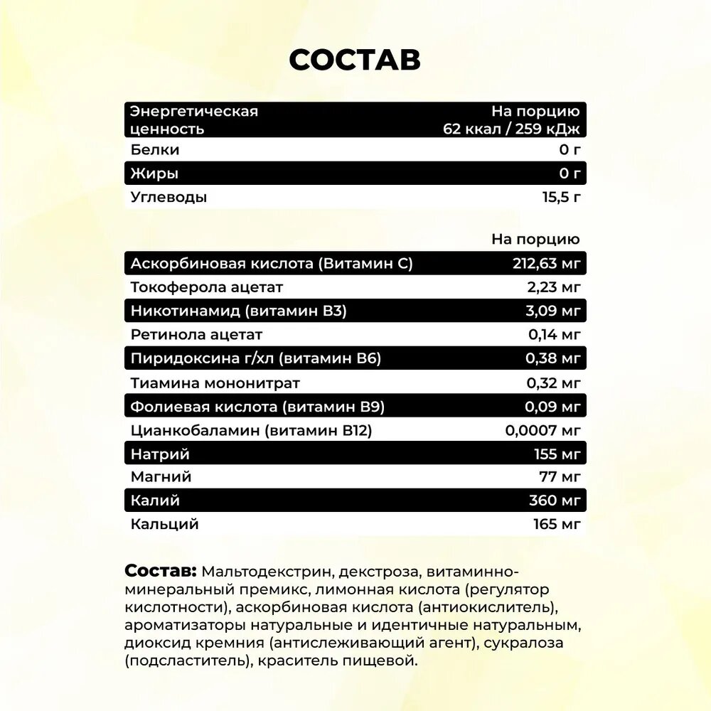 | Дополнительная информация | В качестве дополнения к основному рациону. Смешайте 20 грамм (2 мерных ложки с горкой) напитка с 500-600 мл воды. Пейте небольшими глотками (по 2-3) перед тренировкой (на разминке), во время тренировки и после нее, не дожидаясь наступления жажды. |