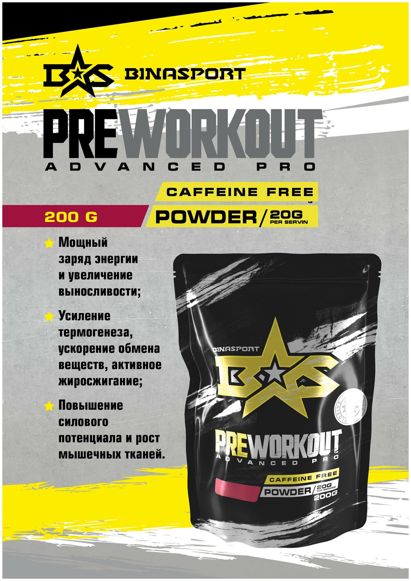 Купить Предтренировочный комплекс Binasport "Preworkout Advanced Pro caffeine free" (без кофеина) порошок 200 г со вкусом вишни