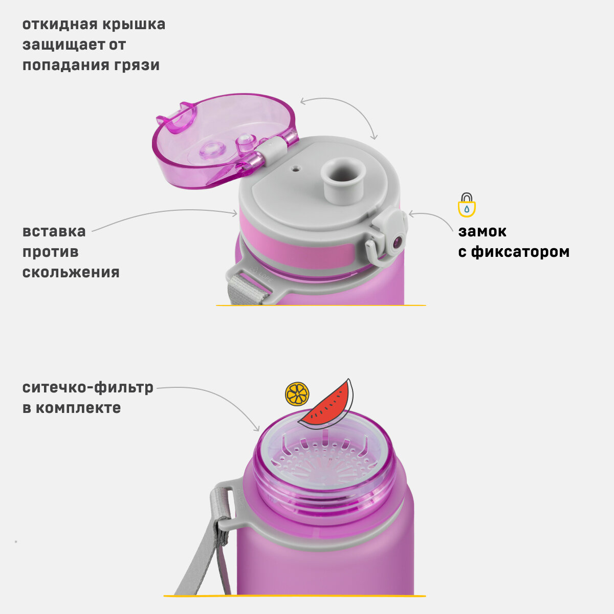 | Особенности | закрывается на замок, мерная шкала, петля для переноски, носик для питья |