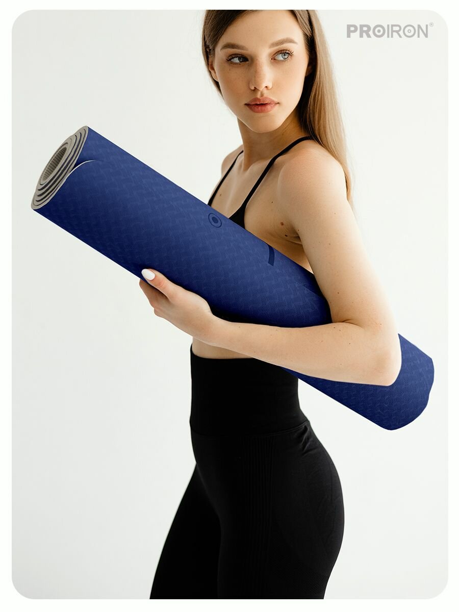 Коврик для фитнеса и йоги нескользящий PROIRON, размеры 1830*800*7мм, материал TPE, серо-синий
