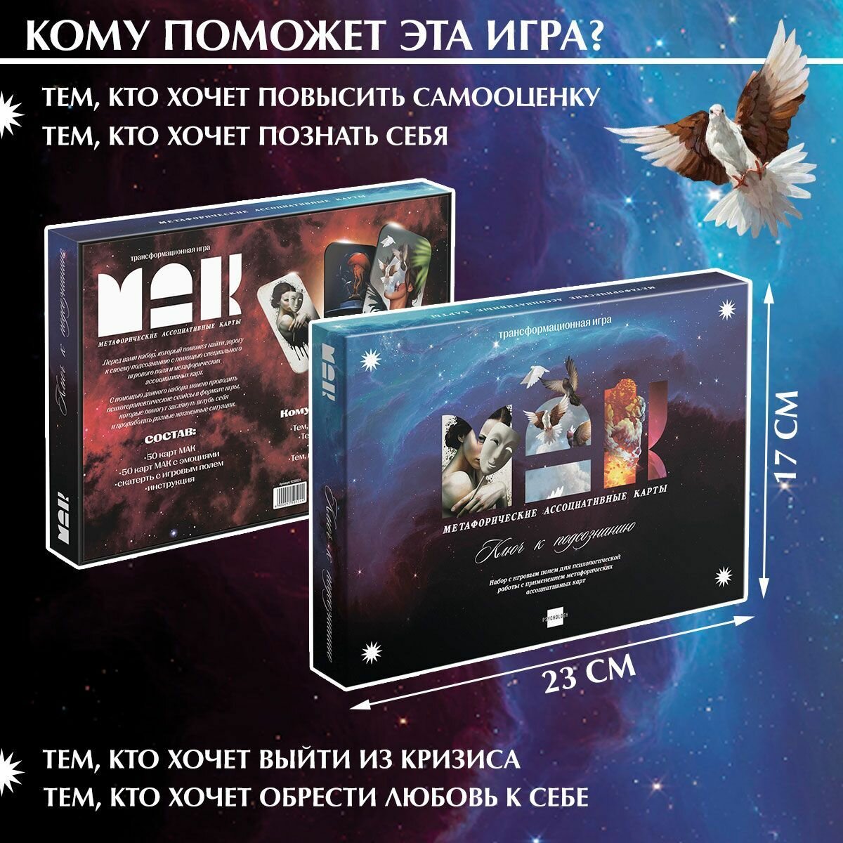 | Подробная комплектация | 50 карт МАК; 50 карт МАК с эмоциями; скатерть с игровым полем; инструкция. |