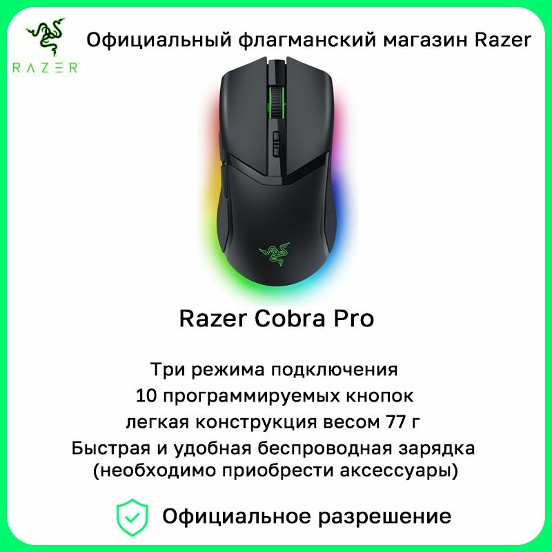 | Комплектация | Razer Cobra Pro, Razer HyperSpeed Wireless Dongle + переходник USB-донгла, Кабель Speedflex USB Type A/Type C, Важная информация о продукте |